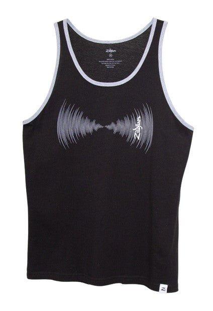 The new Zildjian Muscle Tank is a soft, black cotton tank with contrasting heather gray piping around the neck and arm openings. This tank has a modern, loose fit and comes in unisex sizing. Featuring a soundwave cymbal graphic on the front and the Zildjian trademark logo between the back shoulders, this tank has a fresh, stylish look perfect to wear on its own or under a jacket.