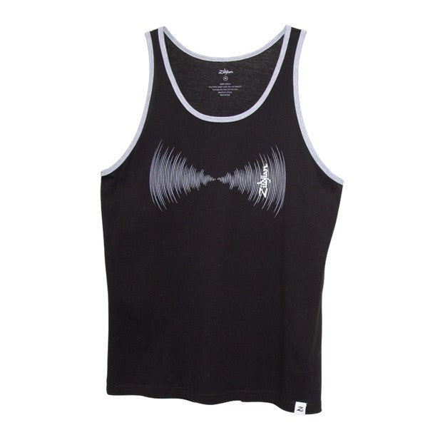 The new Zildjian Muscle Tank is a soft, black cotton tank with contrasting heather gray piping around the neck and arm openings. This tank has a modern, loose fit and comes in unisex sizing. Featuring a soundwave cymbal graphic on the front and the Zildjian trademark logo between the back shoulders, this tank has a fresh, stylish look perfect to wear on its own or under a jacket.