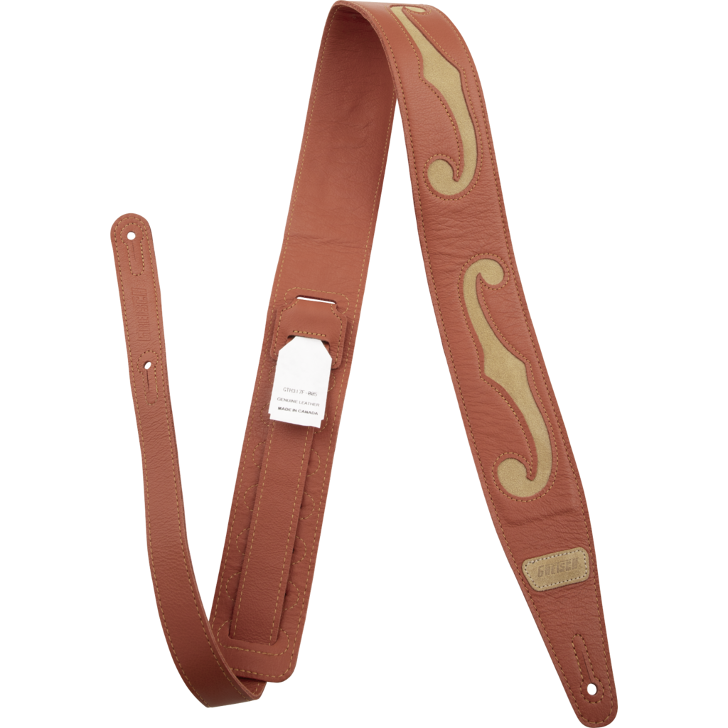 This Gretsch® leather strap features "F" holes, with the Gretsch® logo at both ends, completely adjustable, made in Canada and available in Orange with Tan "F-Holes