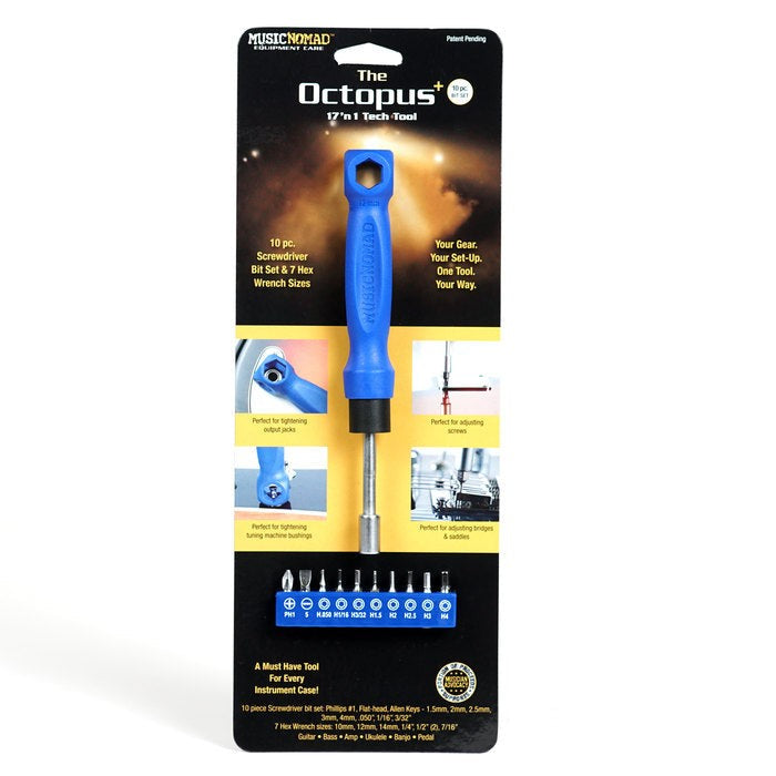 Forget lugging around screwdrivers, nut drivers, wrenches and Allen Keys or multiple bit sets in bulky cases, The Octopus 17 ‘n 1 Tech Tool can handle every job! MusicNomad’s patent-pending, innovative design is the perfect tool for tightening or loosening screws and hex nuts on vital gear components like bridges, saddles, locking nuts, output jacks, control pots, tuning machine bushings and more. Just say no to metal.... tools that is! Our ergonomic handle is made from strong ballistic nylon material that won’t scratch or ding your hardware and is engineered for the most popular hex wrench sizes: 10 mm, 12 mm, 14 mm, 1/2” (2) & 7/16”. Our unique handle also holds the universal adapter giving you even more versatility. The metal universal adapter features a 7th 1/4” hex wrench for tightening or loosening hex nuts, in addition it securely holds our 10-pc screwdriver bit set. Our screwdriver bit set features Phillips & flat head bits along with 8 Allen key bits (0.050", 1/16", 3/32", 1.5 mm, 2.0 mm, 2.5 mm, 3.0 mm, 4.0 mm) for nearly any kind of screw you may find on your gear. It tackles every job including precision adjustments to pieces like tremolo systems. Take out the universal adapter to utilize our 1/2” narrow-profile hex wrench for tightening tough-to-reach sunken pots & Tele cups. This little tool delivers big results and is a must-have for every instrument case.