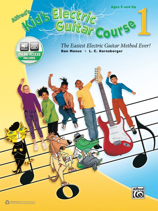 Alfred's Kid's Electric Guitar Course is a fun method that teaches kids how to play songs on the electric guitar right away! Every lesson is explained in plain language that's easy to understand, and accompanying online audio demonstrations let them hear how the music should sound. Kids learn from three irresistible guitar experts---a clever classical dog, one cool jazz cat, and a friendly alligator who loves the blues. They draw attention to what's important on each page and help them learn by making music fun. Parents can be effective guides in helping their kids through this course, even if they've never had any musical training themselves.