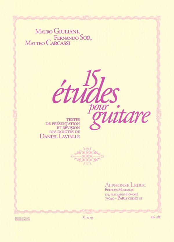Classical guitarists of the early 1800s, Mauro Giuliani, Frenando Sor and Matteo Carcassi compiled a substantial study book for aspiring guitarists, filling a large gap. Daniel Lavialle's revisions in 15 Studies for Guitar include detailed written instruction and fingerings. This compilation addresses rhyhtm, counterpoint, intervals, arpeggios, scales, variations in key signatures and time signatures, chords and performance directions, amongst other aspects. For all aspiring guitarists, 15 Studies for Guitar is essential to improving technique.