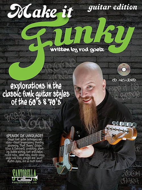Make It Funky * Guitar Edition published by Santorella Publications is a celebratory investigation of the classic, funk guitar sounds & styles of the FUNK ERA (1965-1980). Within these 80 pages, you’ll uncover the techniques & styles of the funk-guitar masters that made it all happen by introducing the essential vocabulary necessary for playing funk-guitar. This incredible assortment includes strumming, scratching, skanking, bubble picking, funk articulation, muted notes, dead notes, and “Swunk” styles. In addition, you’ll build your understanding and application of funk-style harmony in major, minor & dominant styles. Make It Funky written by Rod Goelz is an absolute must for any serious guitar or bass student that likes to groove. The complete rhythm section performance accompaniment CD includes every example in the styles of those who made them famous. This fantastic collection features the styles of James Brown, Parliament, Funkadelic, The JB’s, Kool &The Gang, Prince, Tower Of Power, Sly &The Family Stone, The Meters, Larry Graham, The Average White Band, Rufus, Maceo Parker, The Bar-Kays, Zapp, Bernard Edwards of Chic, Ohio Players, Chuck Brown & The Soul Searchers, The Brothers Johnson, The Fatback Band and other artists from the “FUNK” era. So as James Brown would say, “Let’s Get Funky!”