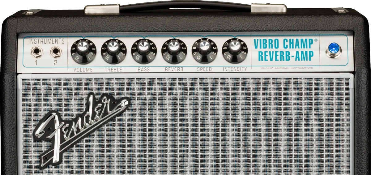 At just 5 watts, the original Vibro Champ® was famous for classic Fender tremolo, tube sparkle and killer grind at a reasonable level. The ’68 Custom Vibro Champ Reverb improves on this classic amp by adding a hall reverb and using a larger 10” speaker for increased low end. These additions make this little wonder perfect for rehearsal, home recording and even small gigs. Amplifier comes with fitted cover. Optional 2-Button Vintage Style (P/N: 0994058000) available.