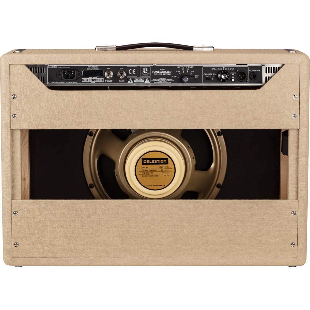 In a bold Fender first, the Tone Master Deluxe Reverb Blonde amplifier uses massive digital processing power to achieve a single remarkable sonic feat: faithfully modeling the circuitry and 22-watt power output of an original Deluxe tube amp. A high-performance 100-watt digital power amp is used to achieve the headroom and dynamic range of a real vintage Deluxe tube amp. The resonant pine cabinet is paired with a single Celestion® NEO Creamback speaker for a more distinctive rock 'n' roll flavor. The result is tubeless Deluxe Reverb tone, volume and dynamics virtually indistinguishable from the all-tube original. The amp model has been modified to remove the virtual bright cap on the Vibrato channel, which gives modern players greater tonal flexibility when using distortion and overdrive pedals. Additionally, the reverb control now provides easier fine tuning at lower settings. Perhaps most notably, even with all these features and more, the Tone Master Deluxe Reverb is in fact about only half the weight of an all-tube Deluxe. The blonde vinyl covering elegantly evokes classic early-’60s Fender vibe, and front panel features give guitarists a playing experience identical to the tube version, including Fender’s world-standard reverb and tremolo effects. Additional rear-panel features deliver modern convenience and flexibility—including an output power selector for full power and five attenuated settings, balanced XLR line output with impulse response (IR) cabinet simulations captured with Shure SM57 and Sennheiser MD421 microphones, mute switch for silent stage or recording use, USB port for firmware upgrades, and more. Output Power / Output: 22 Watts (simulated) Controls: Normal Channel: Volume, Treble, Bass. Vibrato Channel: Volume, Treble, Bass, Reverb. Vibrato: Speed, Intensity Effects: Reverb, Tremolo Amp Type: Digital Speakers: One - 12” Celestion® Neo Creamback Unique Features: Rear-panel output power selector for full power and five attenuated settings, Balanced XLR line output with impulse response (IR) cabinet simulations, level control, and ground switch, Lightweight, resonant pine cabinet, Power jewel illuminates in different colors for normal operation, warmup, and mute/silent mode, USB port for firmware upgrades, Universal worldwide 100V – 240V operation, Cover and two-button footswitch included.