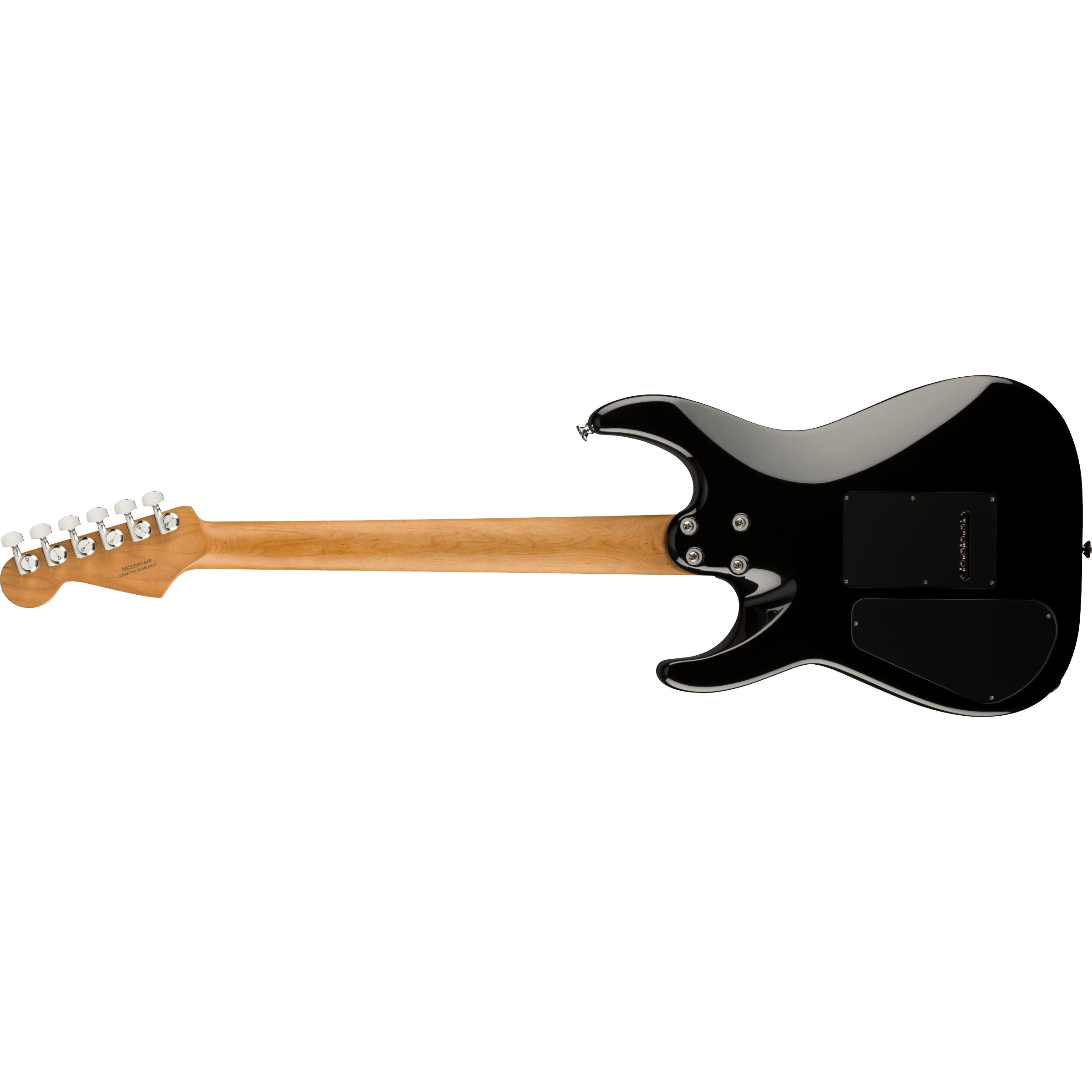 This limited edition Charvel® Super-Stock DKA22 HH 2PT EB comes with an arch body is fashioned from alder and features an elegant black gloss finish. The bolt-on caramelized maple "speed" neck has graphite reinforcement, a silky-smooth hand-rubbed urethane finish, and is topped by a 12"-16" compound radius ebony fingerboard with comfortable rolled edges, 22 jumbo frets and crème dot inlays. A licensed Stratocaster® 6-in-line headstock completes the unique look of this Super Stock axe.