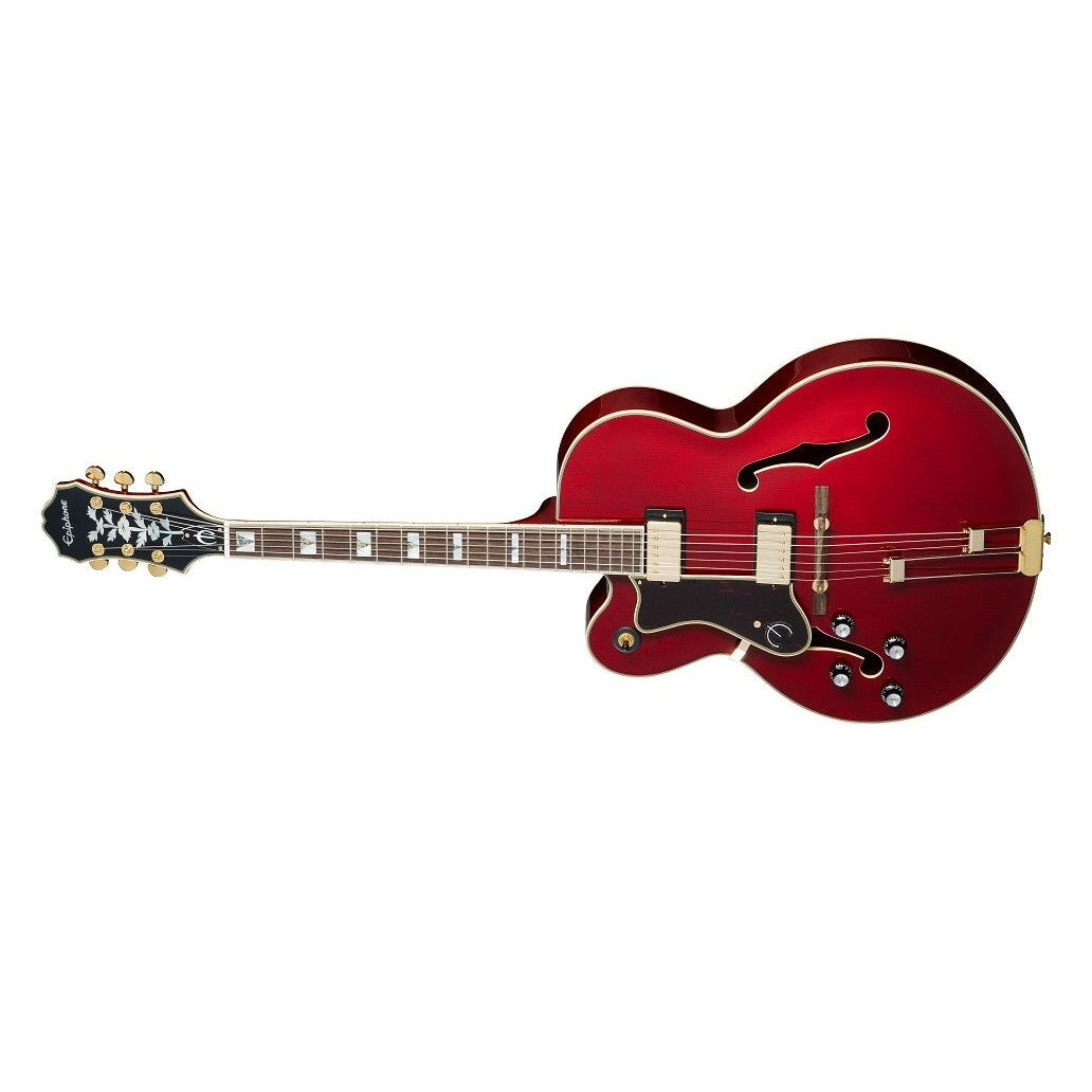 For over 70 years, the classic Epiphone Broadway has been considered the ultimate hollow-body jazz guitar. Now, this legacy-rich instrument has a beautiful new Wine Red finish with Alnico Classic™ Pro humbuckers; a vintage-styled, gold Frequensator™ Split Trapeze tailpiece; and Wilkinson tuners. Gold hardware and other fine appointments like mother-of-pearl and abalone fretboard and headstock inlays add to the subdued class of this versatile archtop.