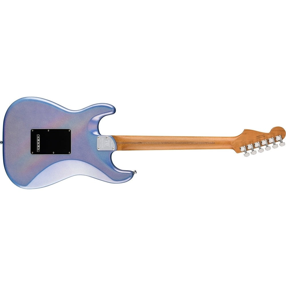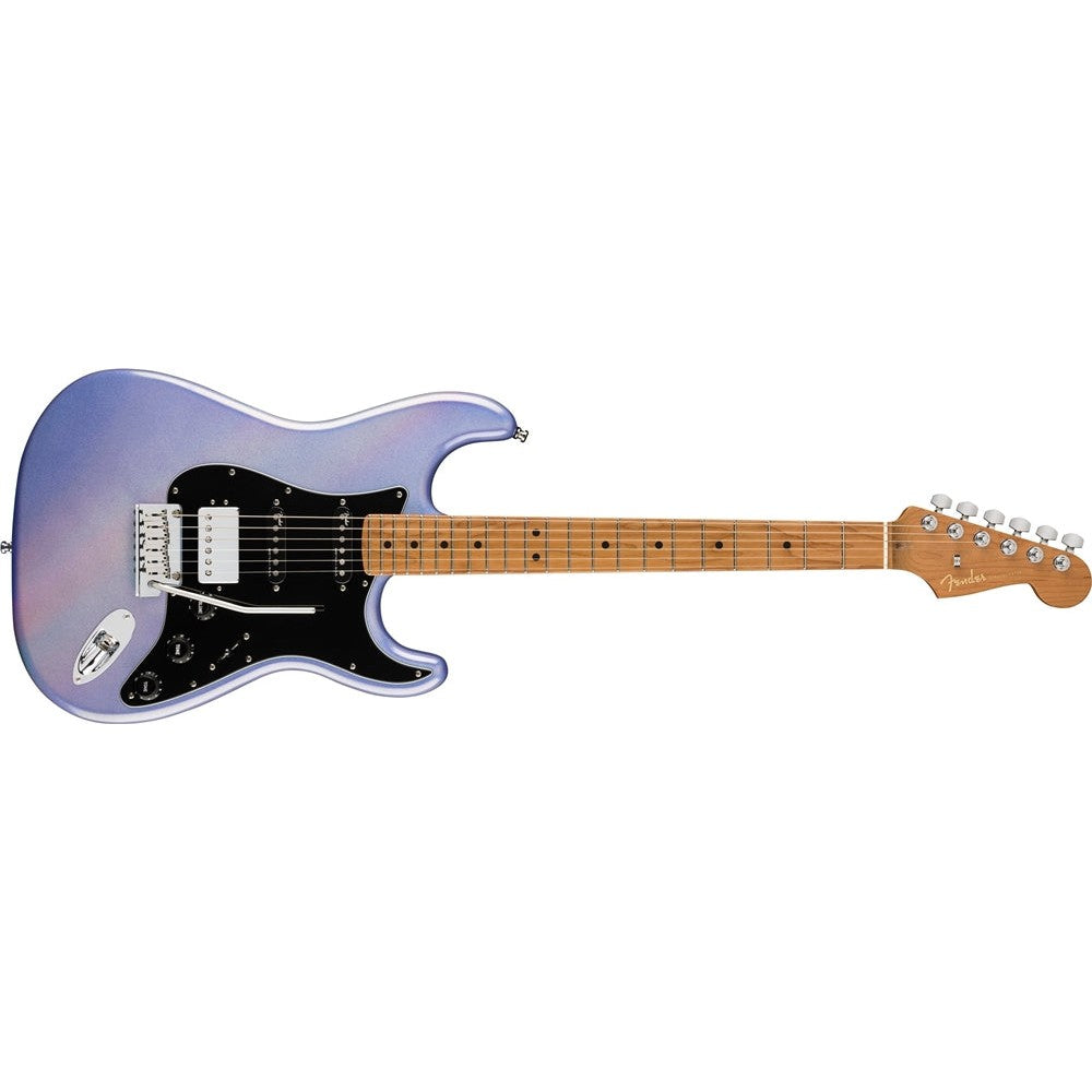 Experience elevated tones and playability with the 70th Anniversary American Ultra Stratocaster HSS. An incredible sight to behold, the lustrous and pearly iridescent amethyst finish dances across the alder body's sculpted contours - changing colors before your very eyes. The 70th Anniversary American Ultra Stratocaster HSS features a unique "Modern D" neck profile with Ultra rolled fingerboard edges for hours of playing comfort. Roasted maple ensures absolute stability and enhanced resonance, while the tapered neck heel allows easy access to the highest register. A speedy 10"-14" compound-radius fingerboard and 22 medium-jumbo frets provide effortless playability across the entire neck. The 70th Anniversary Ultra Noiseless™ Strat® pickups and 70th Anniversary Ultra Quadra Tap™ Humbucker, along with advanced wiring options, provide endless tonal possibilities - with pristine clarity and no hum. Other key features include an Ultra 2-point tremolo bridge, sealed locking tuning machines, chrome hardware and bone nut. Includes vintage-style black tweed case. The 70th Anniversary American Ultra Stratocaster HSS: a versatile, state-of-the-art instrument designed to push your playing to new heights.