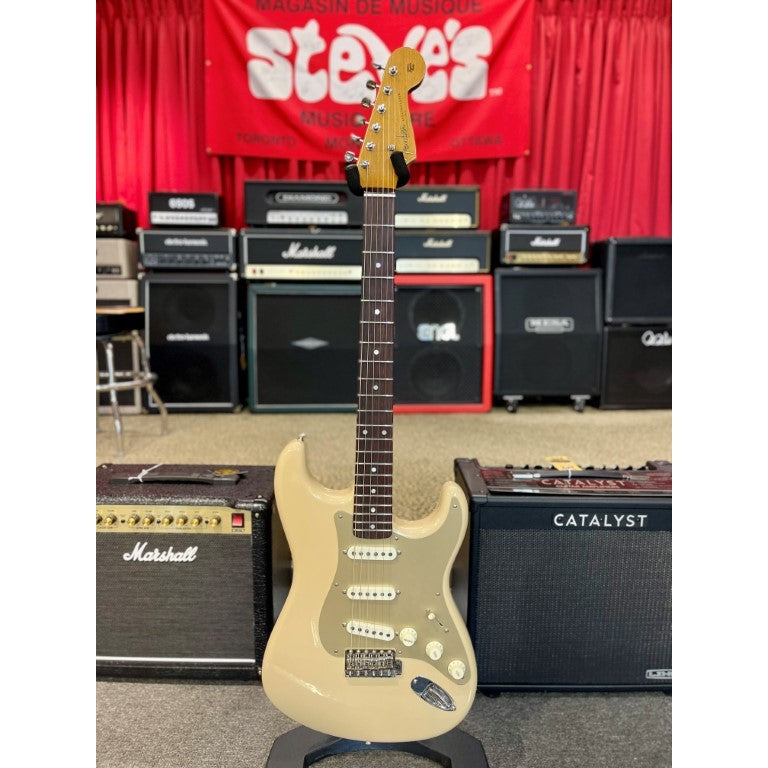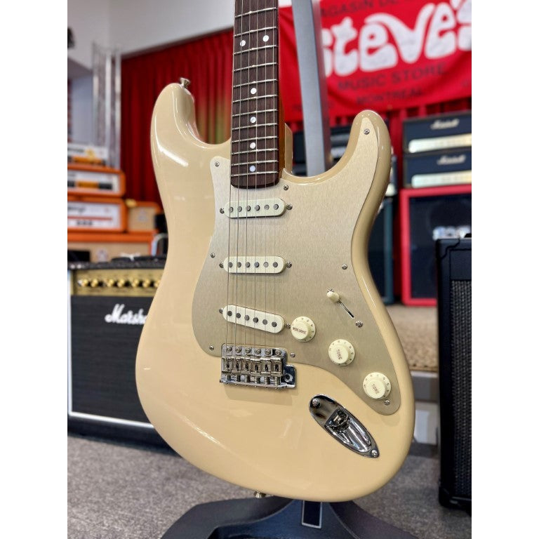 This is the 2023 Limited Edition Roasted Stratocaster Special from the Fender Custom Shop. The guitar has a great combination of '50s and '60s specs: a Large "C" roasted quartersawn maple neck with a flat lam rosewood board, mother of pearl dot inlays, a set of handwound Fat '50s pickups and a single-ply anodized guard that looks so good with the NOS Desert Sand finish!