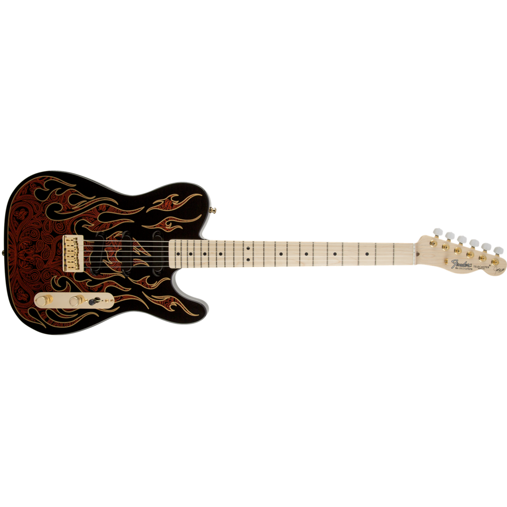 The redesigned James Burton Telecaster® guitar features a basswood body, '60s "U"-shaped neck, three specially designed James Burton pickups, five-way Strat-o-Tele switching, and blue or red paisley flame finish.
