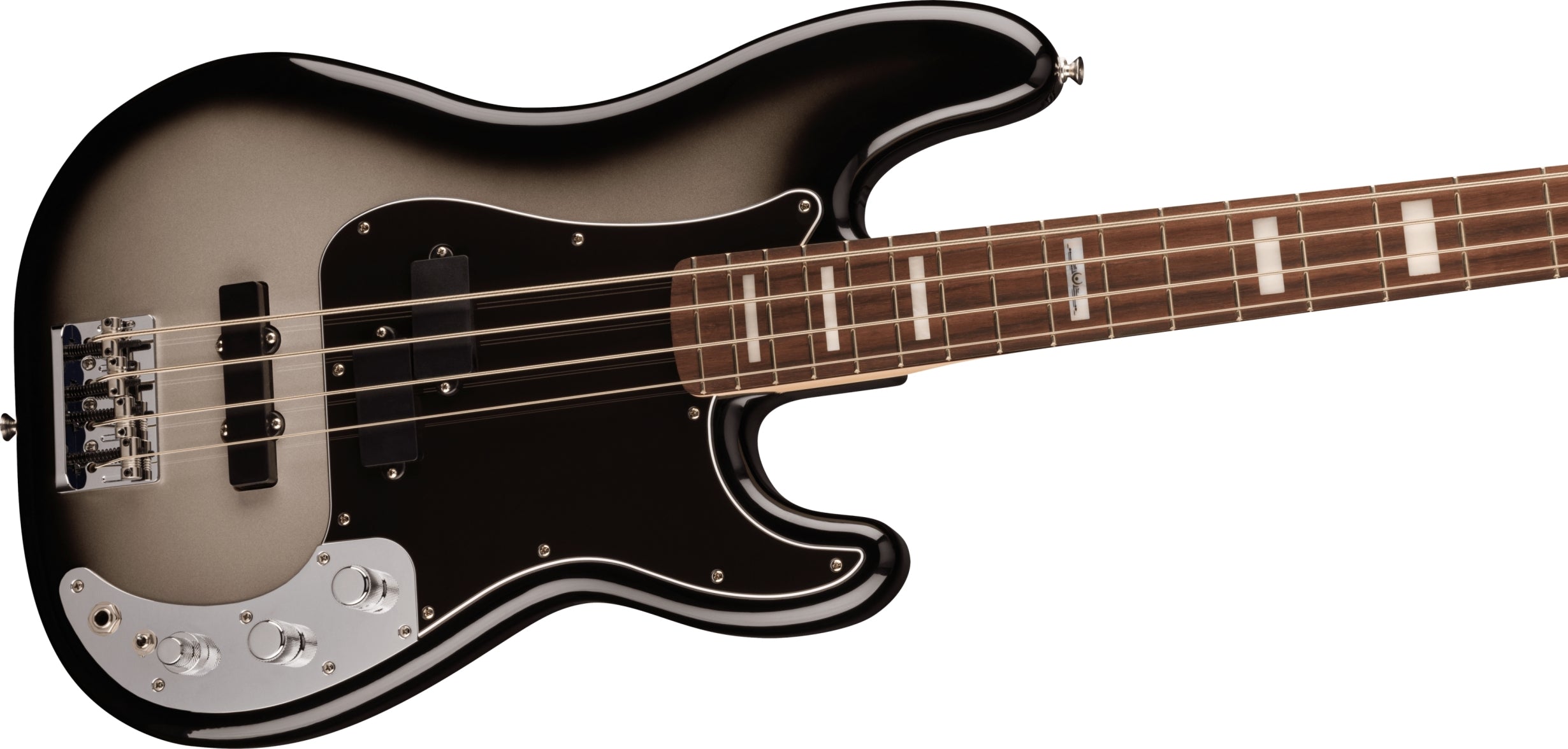 Colossal power is delivered by Tim Shaw-designed custom pickups, custom-voiced 18V preamp, and a Fender HiMass™ vintage bridge. Other key features include an alder body in a mesmerizing Silverburst finish with matching headstock and '70s style Fender logo , distinctive chromed control plate, maple neck with custom ‘70s P Bass® "C" shape, and 9.5"-radius slab rosewood fingerboard with pearloid block inlays and 20 medium jumbo frets.