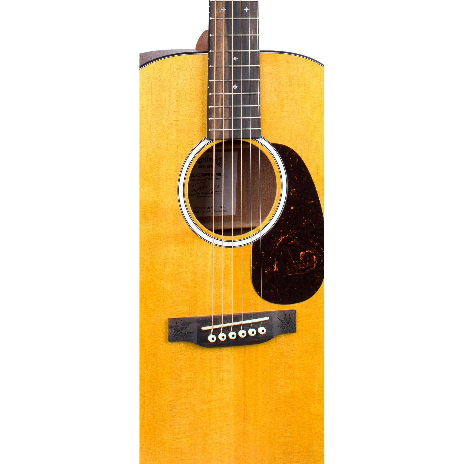 To make this guitar sustainable, Martin used 100% Forest Stewardship Council (FSC) certified tonewoods in the construction and included a gig bag made from recycled ocean plastic that meets the Global Recycled Standard . To achieve a vintage look, a special aging toner was applied to the Sitka spruce top. And to make it as comfortable as possible, Shawn chose a slightly scaled-down, auditorium-style body.
