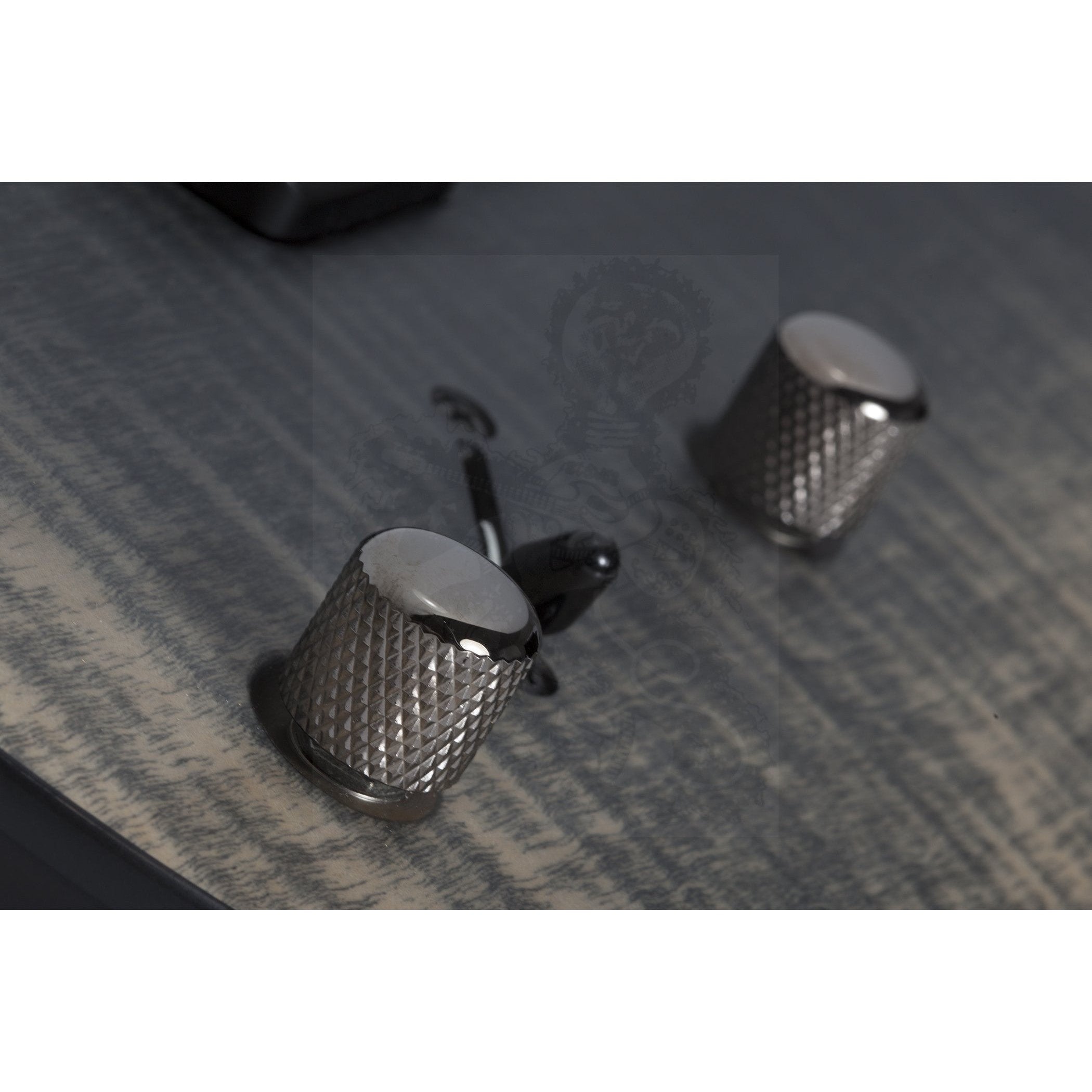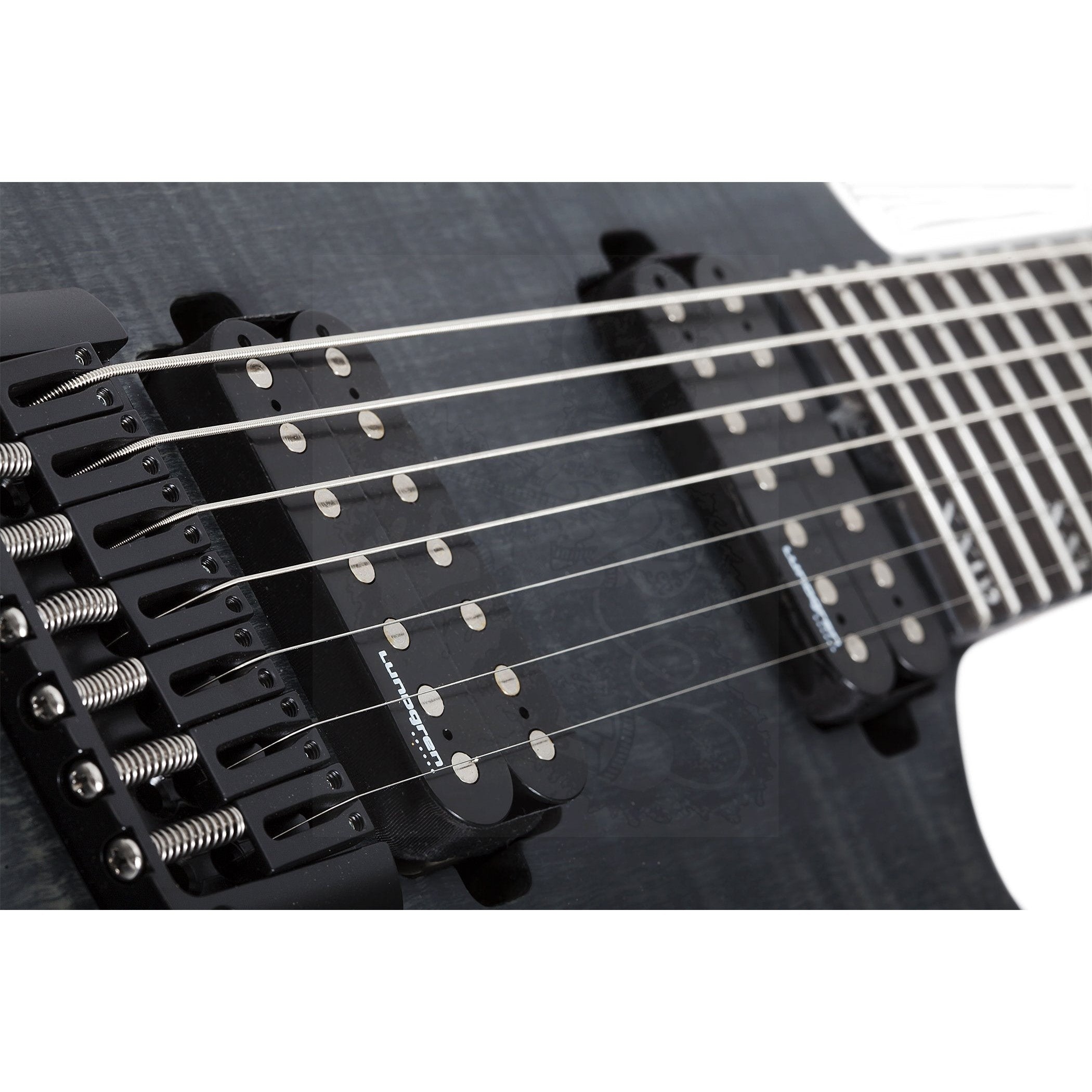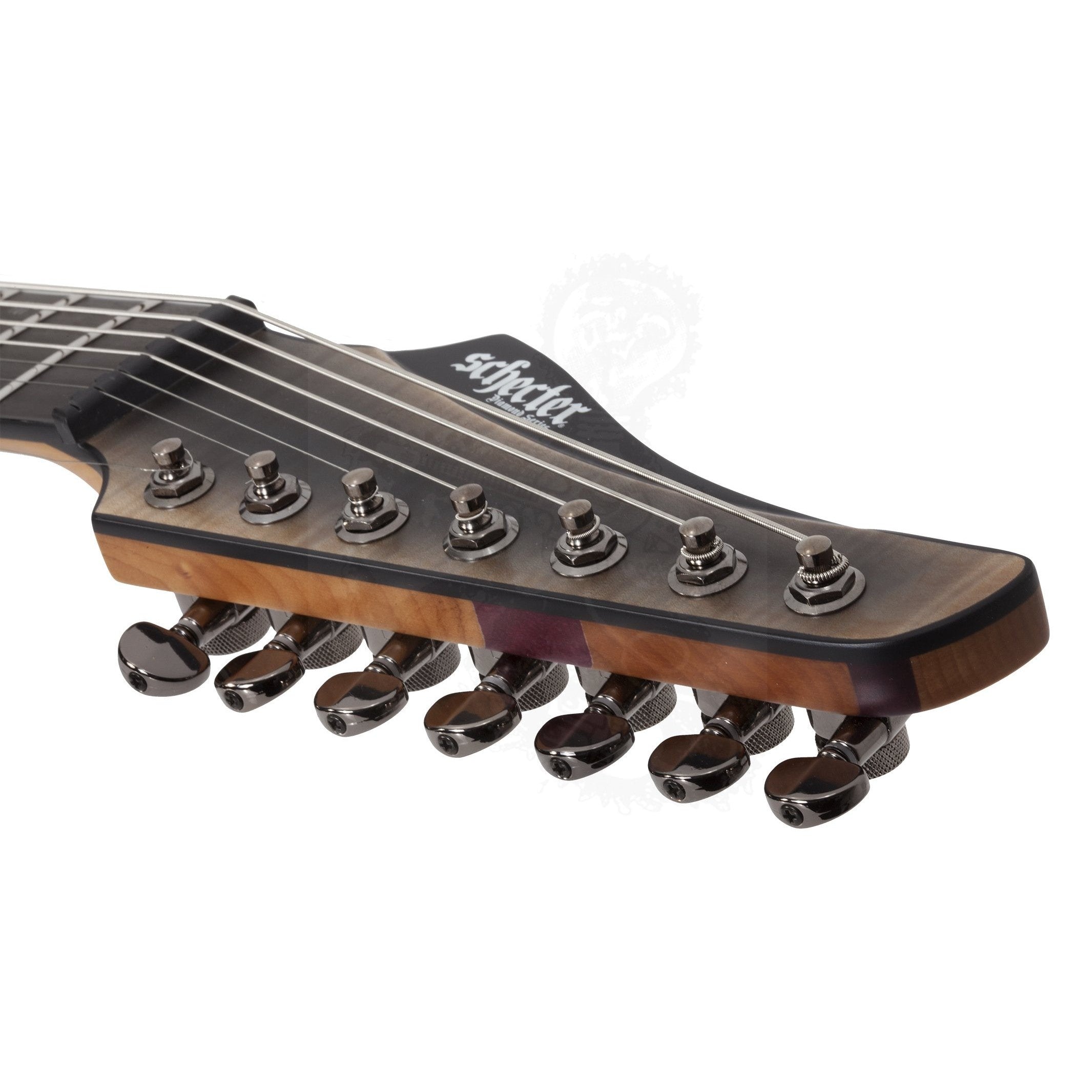 Neck Tuners: Schecter Locking Fretboard: Ebony Neck Material: Roasted Maple/Purpleheart Multi-ply with Carbon Fiber Reinforcement Rods Inlays: Offset/Reverse Roman Numerals Side Dot Markers: Luminlay Glow in the Dark Scale: 26.5” (673mm) Neck Shape: Ultra Thin ‘U’ Thickness: @ 1st Fret- .748” (19mm)/ @ 12th Fret- .787” (20mm) Frets: 24 X-Jumbo Stainless Steel Fretboard Radius: 12”-16” Compound Radius Nut: Graph Tech XL Black Tusq Nut Width: 1.889” (48mm) Truss Rod: 2-Way Adjustable Rod w/ Heel Access Spoke Wheel Body Guitar Colors: Fallout Burst (FOB) Hardware Color: Black Chrome Top Contour: Radius Top Dexterity: Right Handed Construction: Neck-Thru w/Ultra Access Body Material: Swamp Ash Top Material: Flamed Maple Binding: Black 1-ply Bridge: Hipshot Ibby HM Guitar Bridge Electronics Controls: Volume/Tone (Push-Pull)/3-Way Switch Bridge Pickup: Lundgren M7 Neck Pickup: Lundgren M7 Accessories Knobs: Metal Knurled w/ Set Screw Strings: Ernie Ball 7-String (.009/.011/.016/.026/.036/.046/.062) Case: SGR-1C "Case Sold Separately"