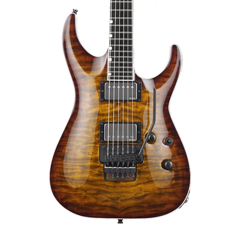 Styled in a tiger eye sunburst finish, the E-II Horizon FR-II is an electric guitar from ESP featuring a mahogany body with a quilted-maple top and a sleek, double-cutaway design. Its three-piece maple neck, fashioned in the neck-through-body style, has a 25.5" scale and is fitted with an ebony fingerboard and 24 extra-jumbo frets. The strings are secured by a set of Gotoh locking tuners, along with a Floyd Rose Original locking tremolo bridge.