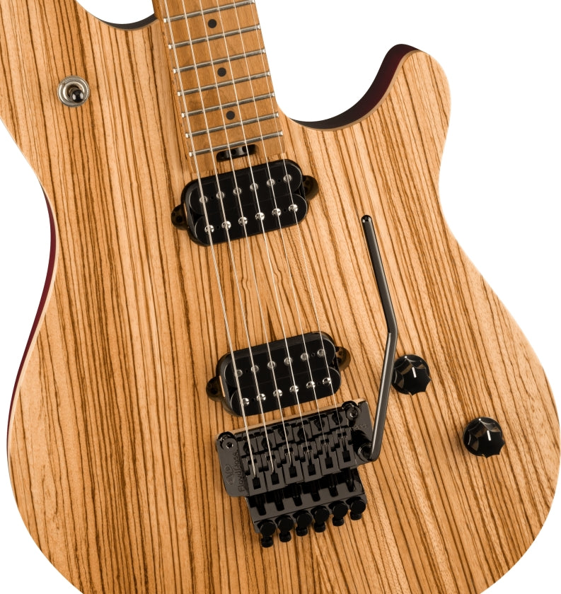 The Wolfgang WG Standard Exotic Zebrawood offers a basswood body with special "comfort cut" forearm contour for maximum playing ease, along with attractive natural body binding and a distinctive poplar burl top. Its bolt-on baked maple neck with graphite-reinforcement rods holds strong against the ravages of temperature and humidity, while a conveniently located spoke wheel at the base of the neck makes for quick and painless truss rod adjustments. Designed for comfortable playability and speed, this stylish axe also features an oiled finish on the back of the neck and a 12"-16" compound radius baked maple fingerboard with rolled edges, 22 jumbo frets and black dot inlaysDual EVH® Wolfgang® humbucking pickups mounted directly to the body increase vibration transfer, resulting in sustain for days on end. Two black knurled control knobs have been dialed-in to Van Halen's exacting specifications - the smooth-feeling 500k pots make it easy to find a unique sound while retaining the crisp high-end sparkle of the Wolfgang pickups. The EVH-branded Floyd Rose® Special bridge and R2 locking nut consistently keep the instrument in tune through the deepest whammy dives and horse whinnies.