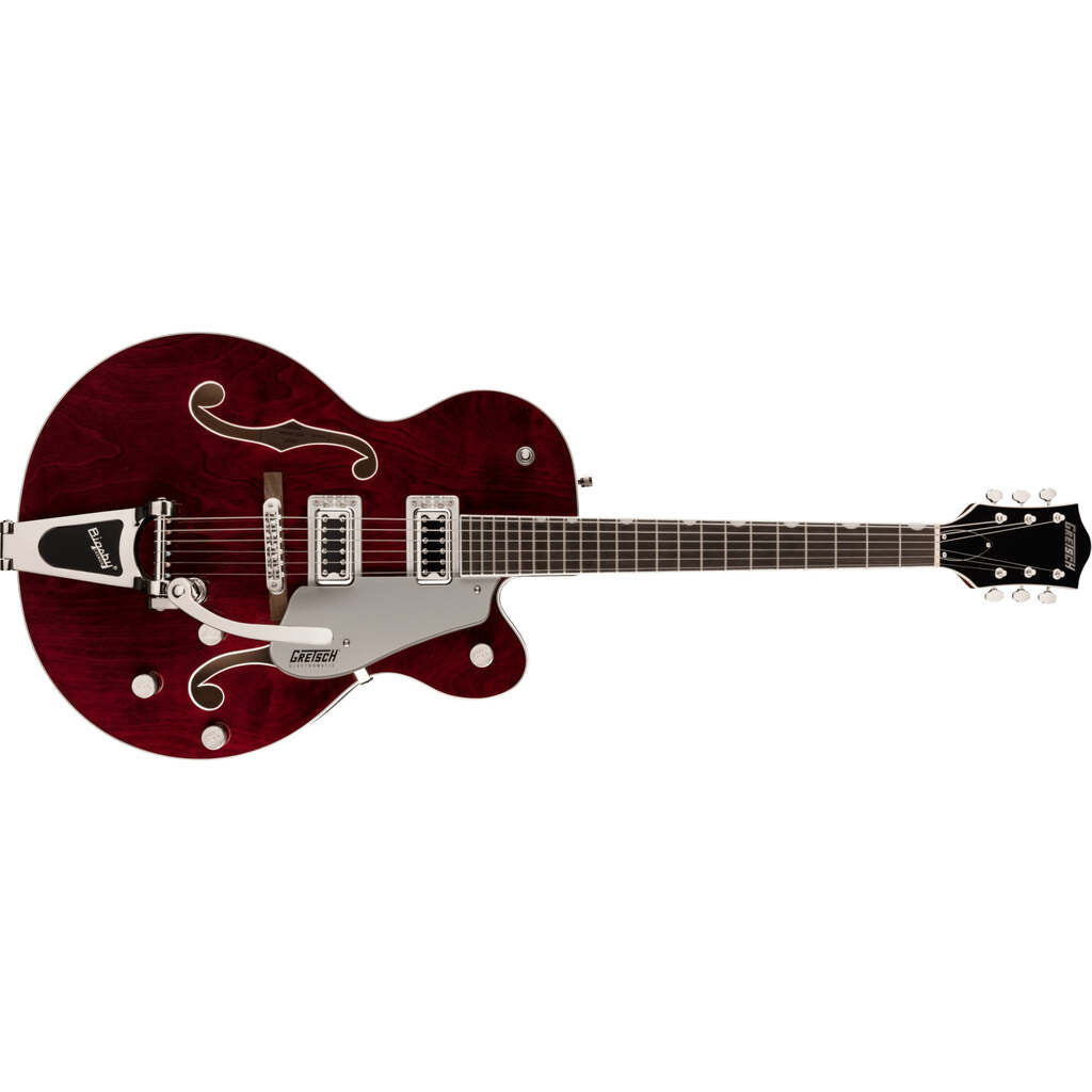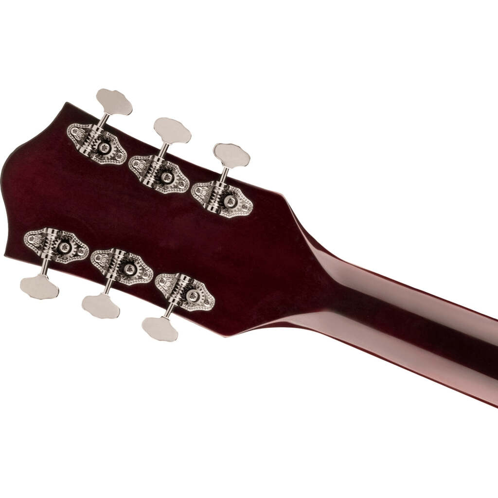 Alive and resonant, the G5420T also features a versatile upgraded control layout including master volume with treble bleed circuit, master tone, individual pickup volume controls and three-position pickup toggle switch, oversized bound F-holes, multi-ply body binding, smaller late-'50s G6120 bound headstock, vintage-style open-back tuning machines, Graph Tech® NuBone® nut, pearloid Neo-Classic™ thumbnail inlays, secured Adjusto-Matic™ bridge and a Bigsby® B60 vibrato tailpiece.