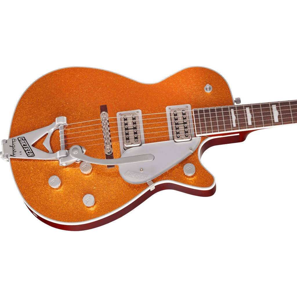 Other features include a maple set neck, 12”-radius rosewood fingerboard with pearloid Hump Block inlays, bone nut, G-arrow knobs, Bigsby® vibrato tailpiece, Adjusto-Matic™ bridge with pinned rosewood base and Gotoh® tuners.