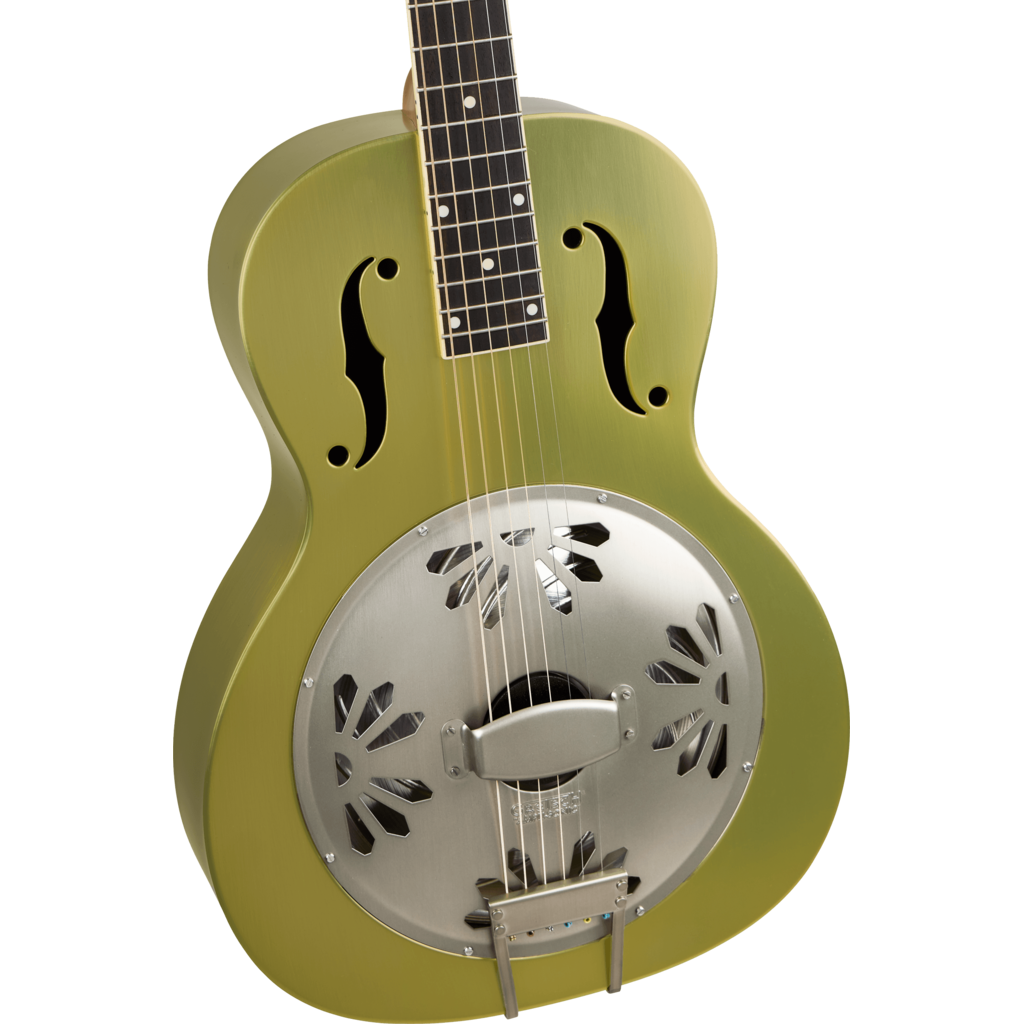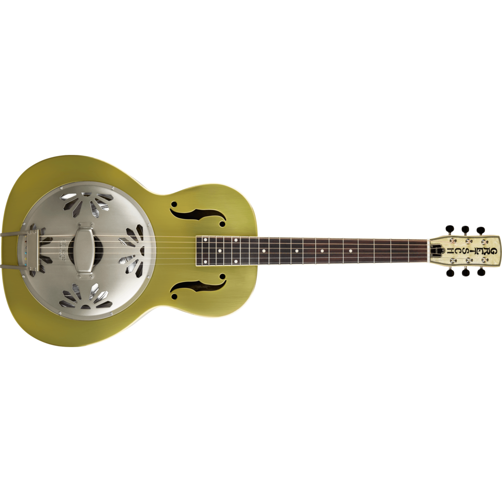 Add some color to your sound with the limited-release G9202 Honey Dipper Special. This round-neck resonator guitar has all the same features as the wildly popular G9201 Honey Dipper, with the additions of aged white fingerboard binding, screened headstock graphic and a weathered "Bell Bronze" finish