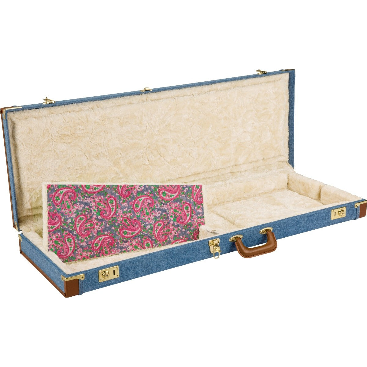 Forever in denim. Built to age and last like your favorite pair of jeans, the Fender® x Wrangler® Denim Case provides the unmistakable look of Wrangler® with the trusted protection and style you know from Fender®. Crafted from durable 3-ply wood, this looks like your everyday Fender case but features unique Wrangler® twists. With its durable denim, classic Fender pink paisley lined accessory compartment, and the iconic “W” back pocket design, this case will turn as many heads as your tightest jeans.