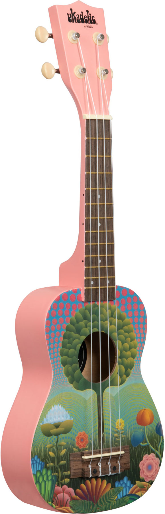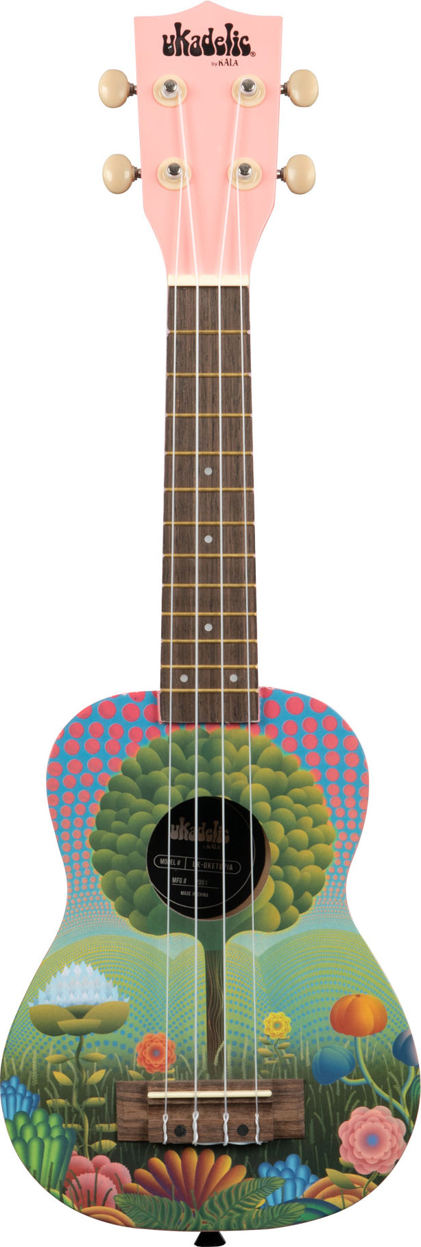 With help and inspiration from the Kala community, we present 6 original designs for the all new wood Ukadelic® Graphic ukuleles. Each one tells a story and makes this new line-up of Ukadelics truly magical! Let them capture your imagination! Available in Soprano with logo bag and packaging. MEASUREMENTS Scale Length: 13.5 inches, Overall Instrument Length: 20.625 inches, Body Length: 9.0625 inches, Number of Frets: 12, Width at Upper Bout: 5.4375 inches, Width at Lower Bout: 7 inches, Width at Waist: 4.75 inches, Body Depth: 2 inches, Fingerboard Width at Nut: 1.4375 inches, Fingerboard width at neck/body joint: 1.75 inches.