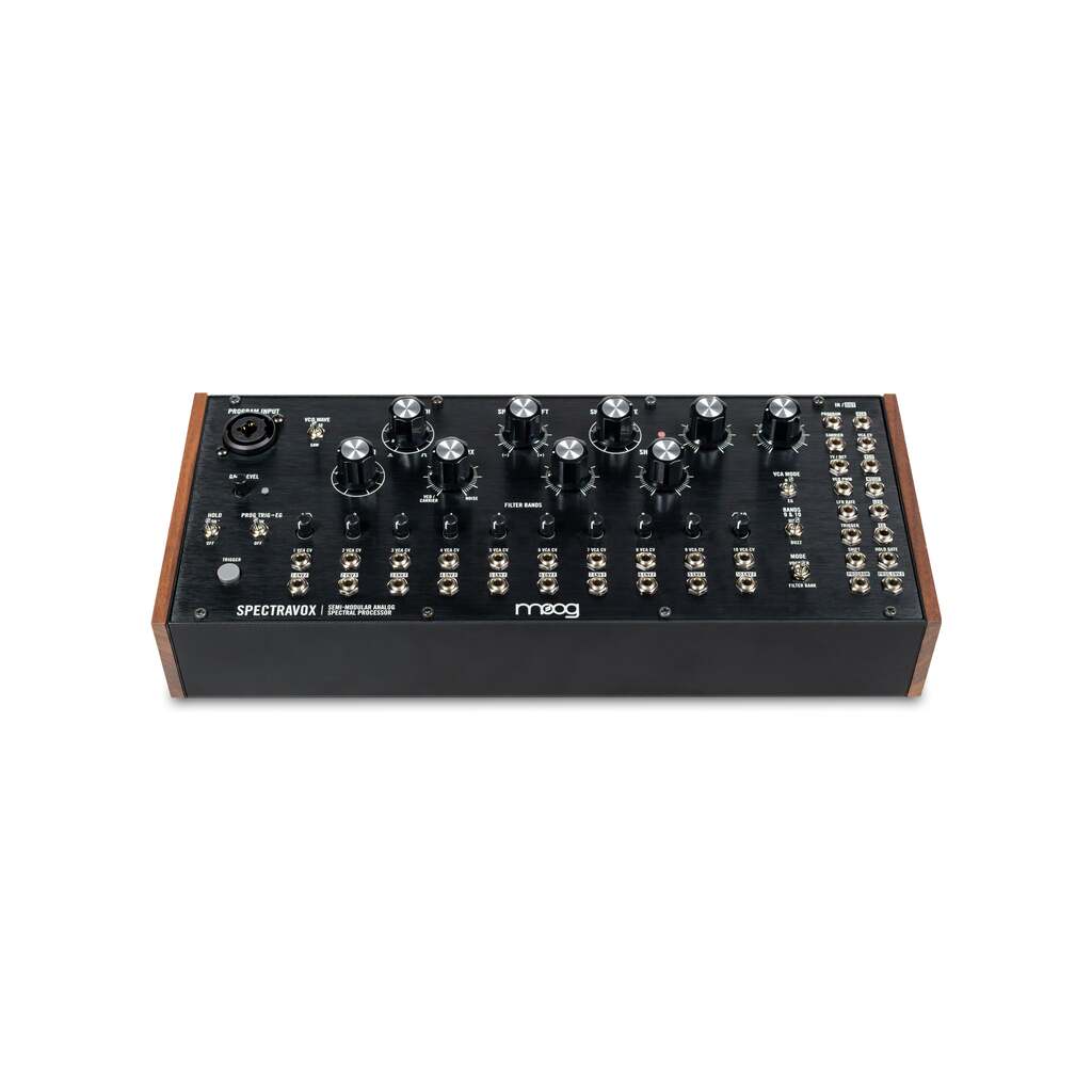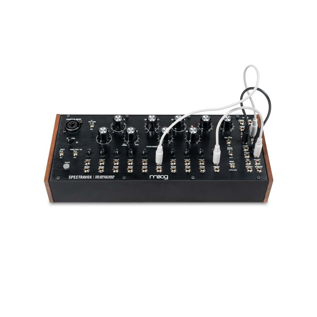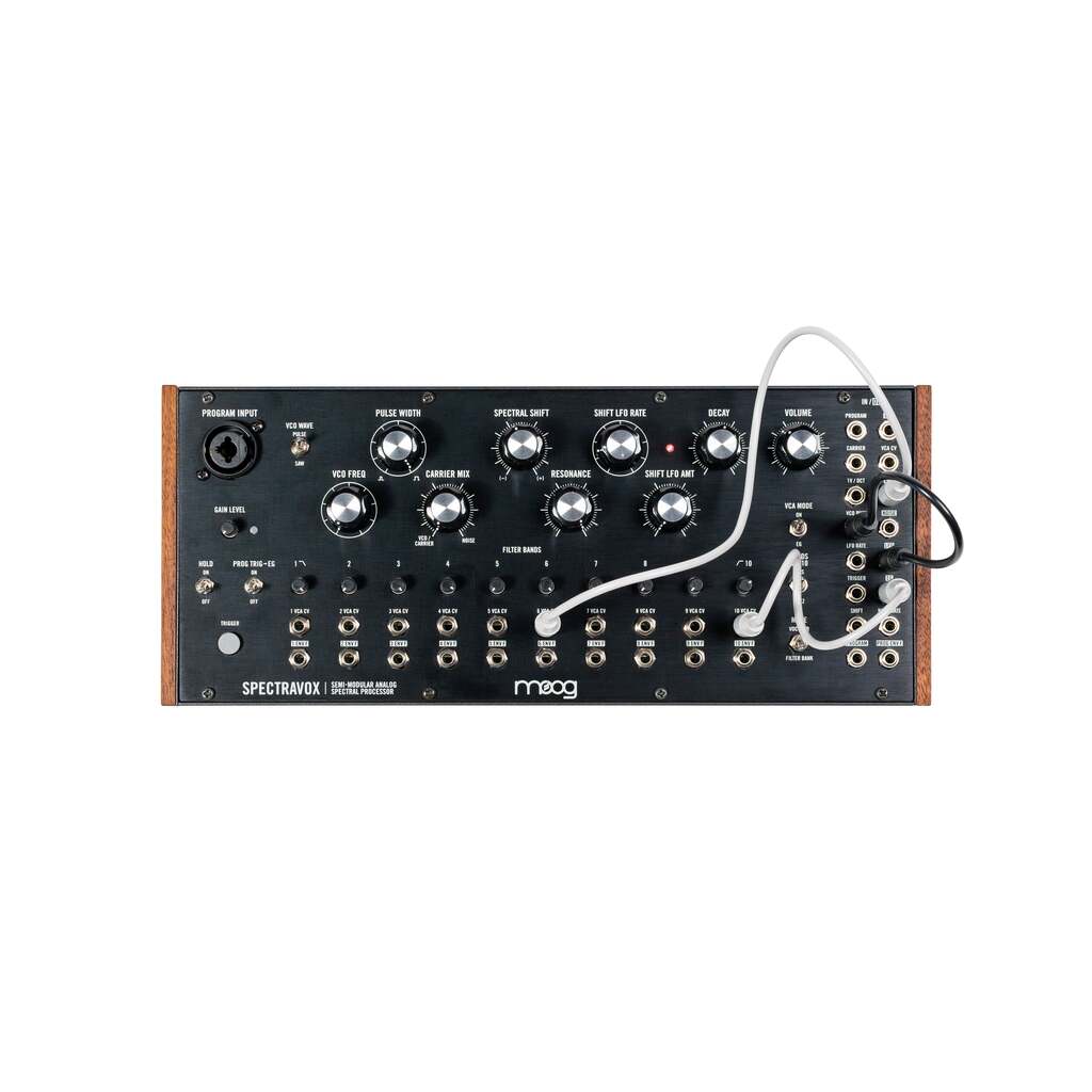 Spectravox, the newest member of the Moog semi-modular family, is a groundbreaking tool for sculpting sound. An analog spectral processor based around a 10-band filter bank, Spectravox creates lively drones and colorful tonal sweeps on its own and adds resonant depth and psychedelic spectral movement to any external sound. Hook up a microphone and Spectravox becomes a 10-band analog vocoder with innovative integrated modulation of all of its filters. An exploration and expansion of the topology of the vocoder and filter bank, Spectravox is a highly flexible instrument and signal processor with a comprehensive patch bay for integration into studios of all sizes.