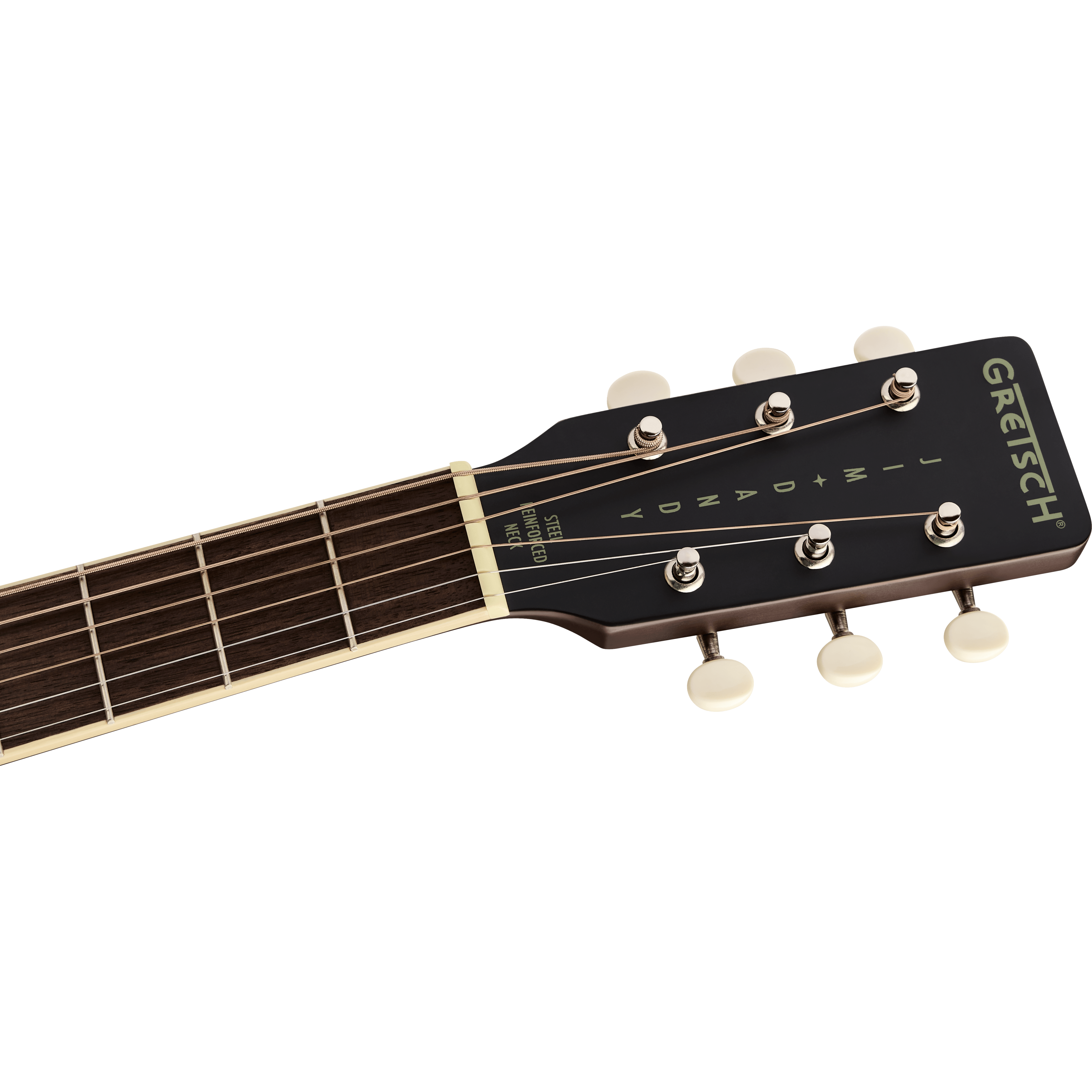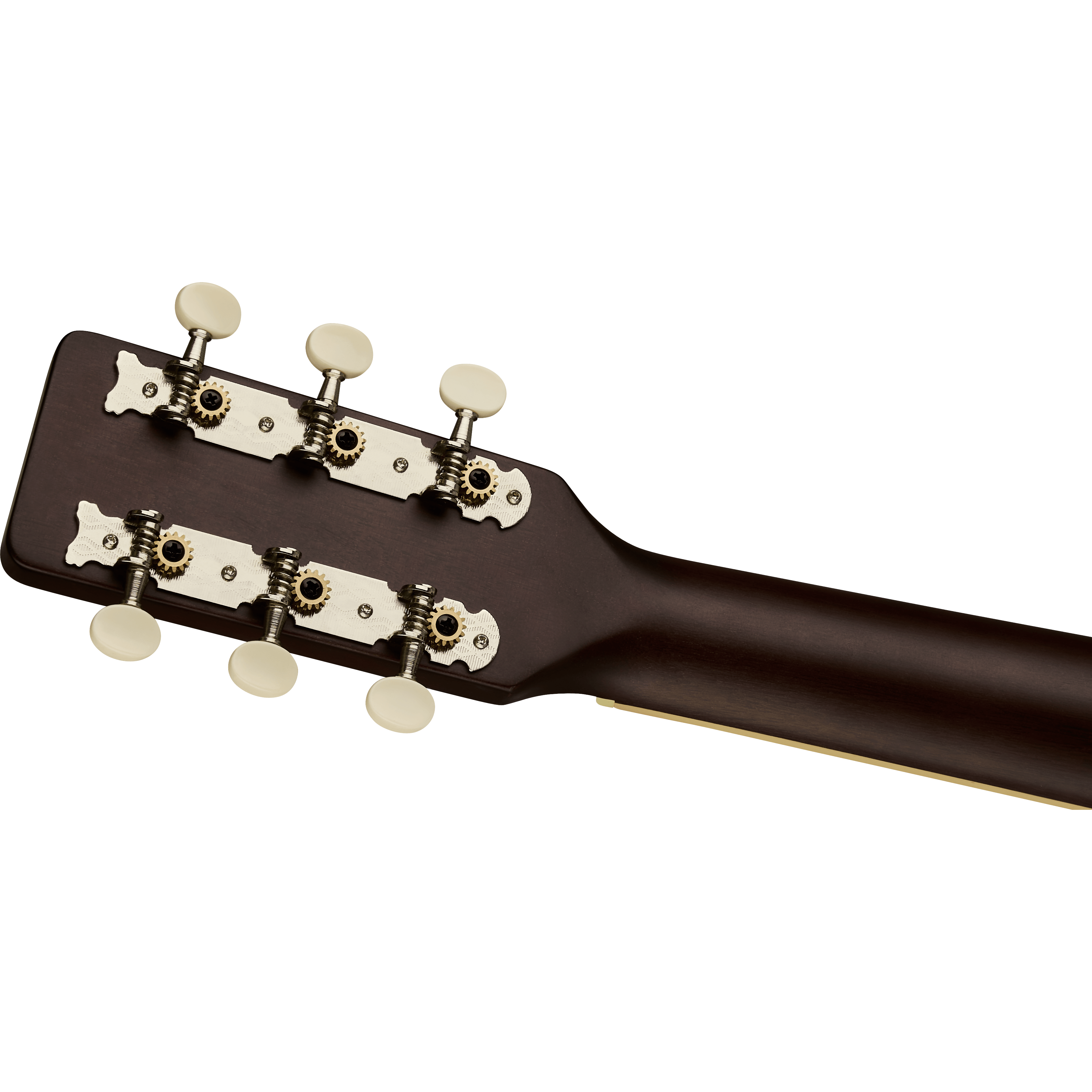 The X-braced body is crafted with select lightweight laminate tonewoods for an optimal balance of woody vintage tone and reliable durability, while the “C”-shape neck presents an inviting feel for hours of old-timey inspiration. Period-correct details such as a vintage-style pinned bridge, “G”-graphic pickguard, painted pinstripe purfling, 3-on-a-plate open-gear tuning machines and oversized dot fingerboard inlays combine for a nostalgic personality destined for any barnburner or jamboree.