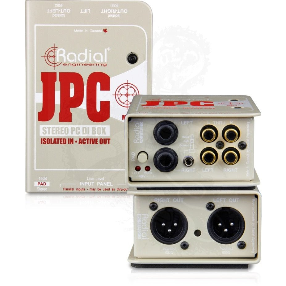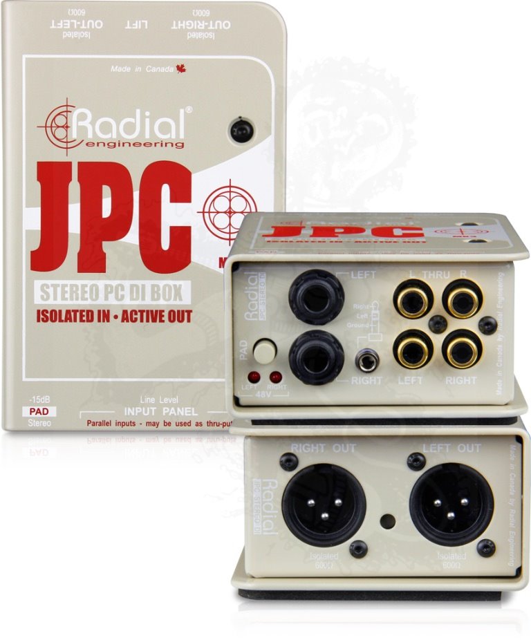 The JPC is a stereo direct box that is easy to use with practically any consumer electronic device. It utilizes active buffers and transformer isolation to create a hybrid circuit that blocks ground loops and reduces system noise, along with AC blocking capacitors to prevent any audio system noise from bleeding back into the computer. The choice of ¼", RCA and 3.5mm input connectors make it easy to interface with all types of unbalanced audio sources such as computers, smartphones, and tablets, and the outputs are XLR balanced mic level to feed snake systems and PAs. Powering the JPC is accomplished via 48V phantom from a mixing console, allowing the JPC to be used in concert environments without requiring an external power supply
