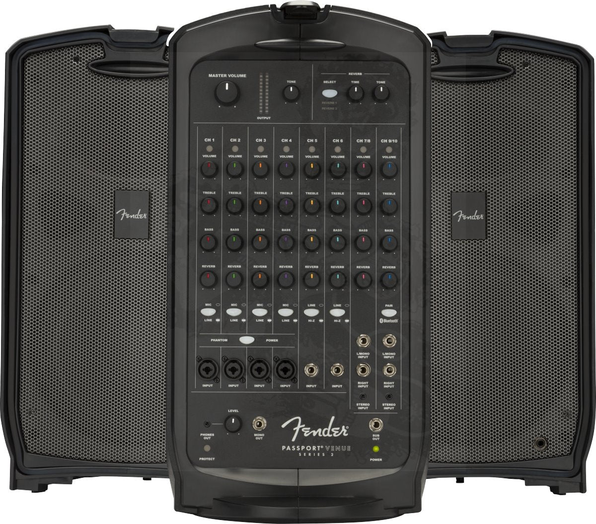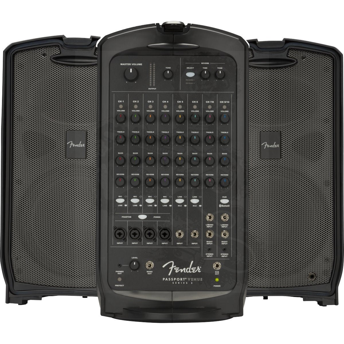 Maximize the sonic punch of any large performance with the Passport Venue Series 2 portable sound system. Featuring Bluetooth® audio streaming and XLR ¼” combination jacks for increased connectivity, Passport® Venue Series 2 has full-range speakers, versatile features, friendly front-panel controls and 600 watts of power for strong, clear and reliable Fender sound ideal for larger venues and occasions—including band and DJ gigs; education, sporting and worship events; meetings, seminars and presentations and more.