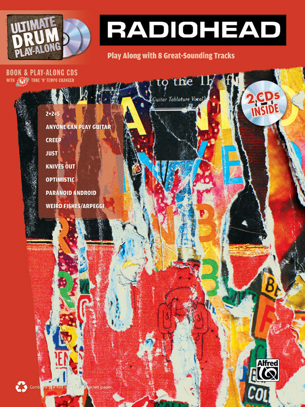 Exact drum transcriptions to eight Radiohead classics. In addition to the complete song charts, drum-only charts are also provided. There are two audio versions of every song on the included CDs: an instrumental sound-alike recording and a version without drums so you can play along. Plus, with the software on the CDs you can access three versions of each song: the full-instrumental sound-alike, a version without drums but with a constant click track, and a version without drums and without a click track. And you can also easily loop sections for practice, slow tracks down or speed them up without changing the pitch, change the key, and switch back and forth between track versions. Titles: 2+2=5 * Anyone Can Play Guitar * Creep * Just * Knives Out * Optimistic * Paranoid Android * Weird Fishes.