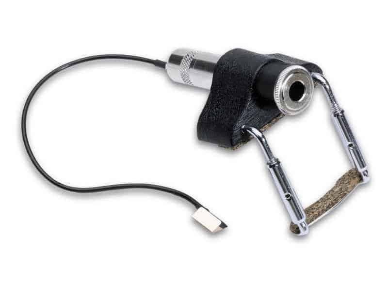 The same pickup element as the V-100, the V-200 employs a Carpenter-style, 1/4 output jack which mounts on the side of the instrument with chinrest-style hardware. An impedance-matching preamp is recommended, but not required.