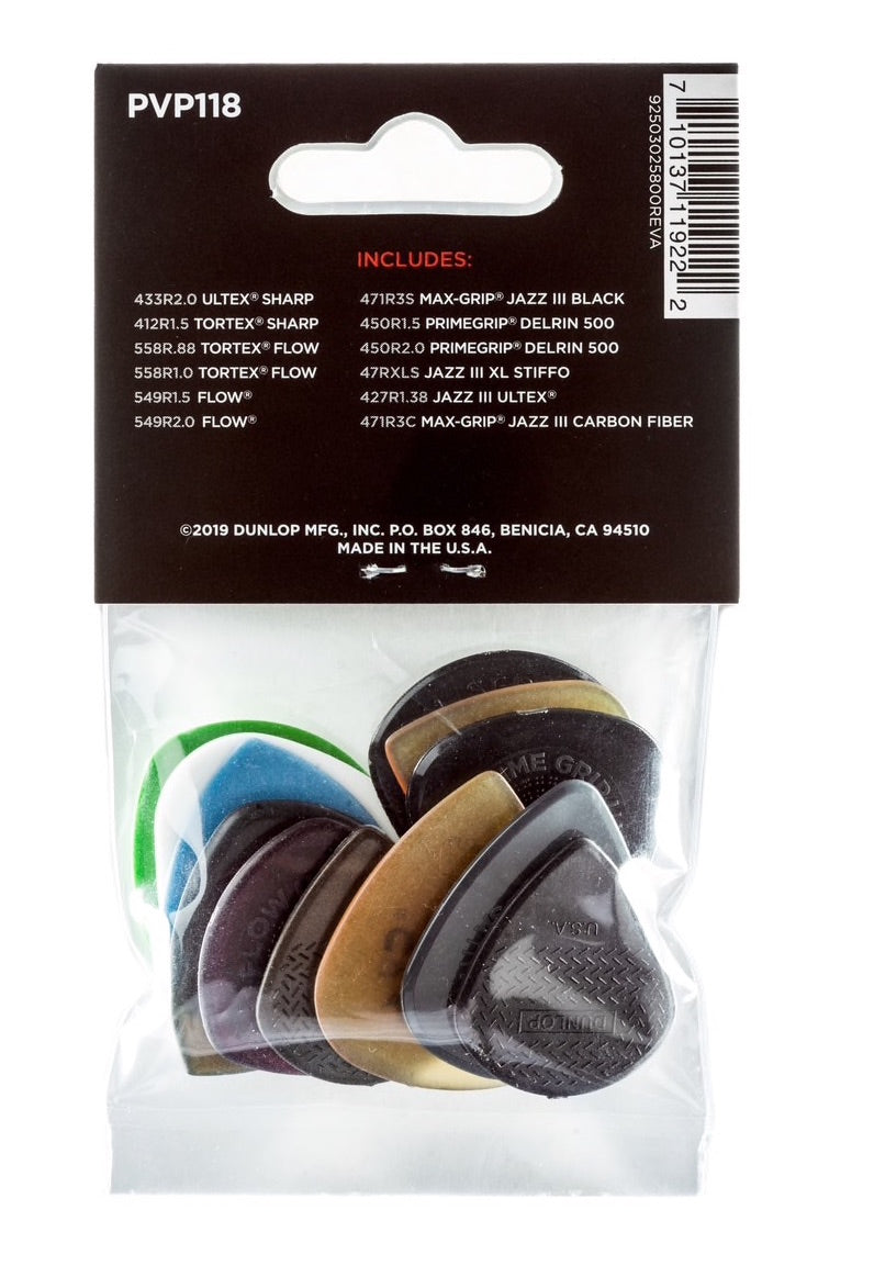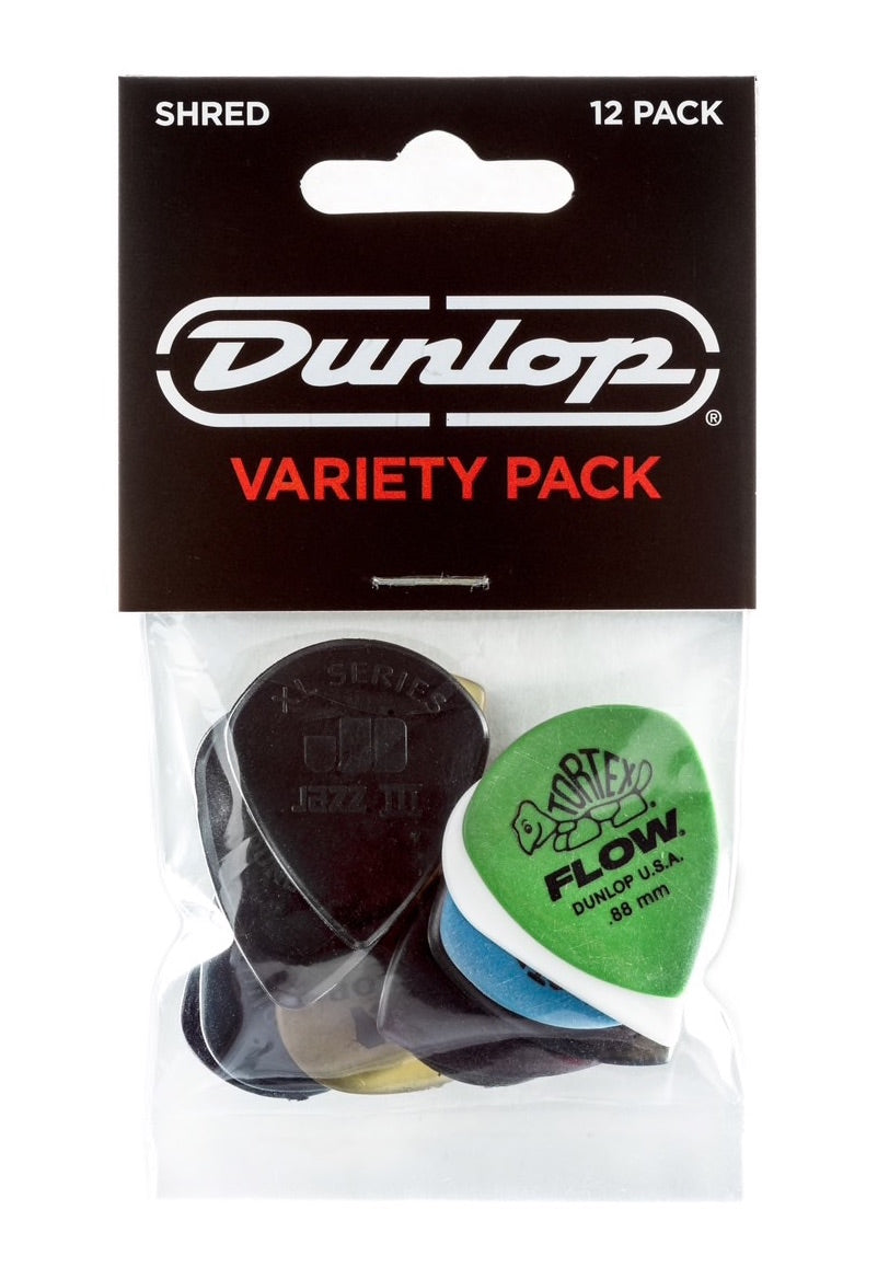 Shred Pick Variety Pack Contains: Ultex Sharp 2.0mm, Tortex Sharp 1.5mm, Tortex Flow .88mm, Tortex Flow 1.0mm, Delrin Prime Grip 1.5mm, Delrin Prime Grip 2.0mm, Flow Standard 1.5mm, Flow Standard 2.0mm, Max-Grip Jazz III Carbon Fiber, Max-Grip Jazz III Black, Jazz III Ultex, and Jazz III XL Stiffo.