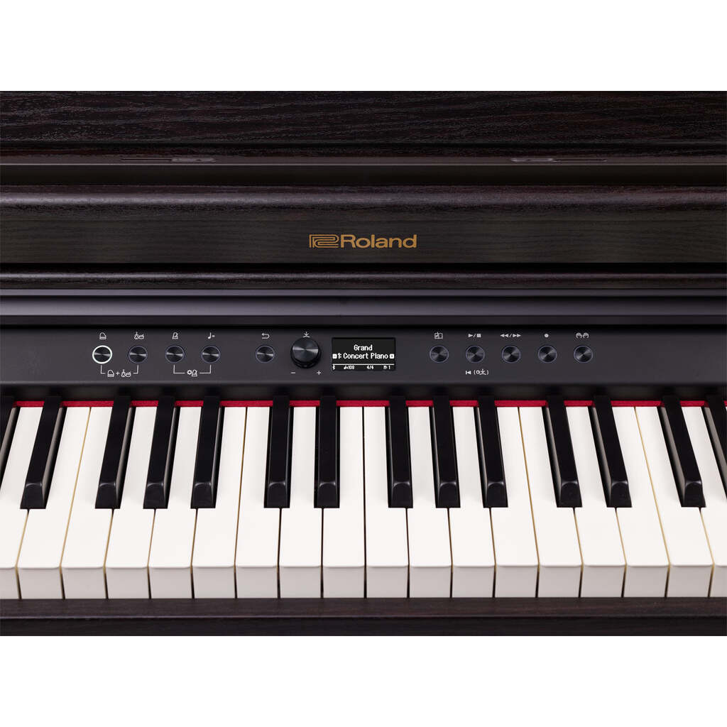 If you’re drawn to the classic contours of an acoustic piano, the RP701 will appeal to you. Influenced by the award-winning design of Roland’s high-end LX and HP series, the sophisticated cabinet blends curves and straight lines, with slim front legs that complete the visual statement. Available in four finishes, the RP701 blends into a wide variety of room styles. Try soothing and subtle dark rosewood, or a light oak finish with its fusion of elegant oak grain and fashionable greige accents. Or just keep it classic with the striking white or contemporary black options.