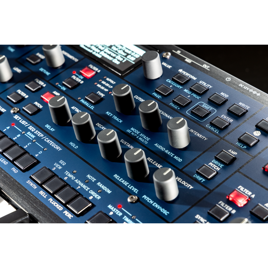 An instrument that sounds this great deserves to look and feel fantastic, too. The new semi-weighted keybed is smooth and expressive, and knobs with just the right amount of resistance are perfect for dialing in your sounds. The solid aluminum front panel is built for the road, and the wooden side-panels and blue-on-black color scheme shout out to the original Mono/Poly design.