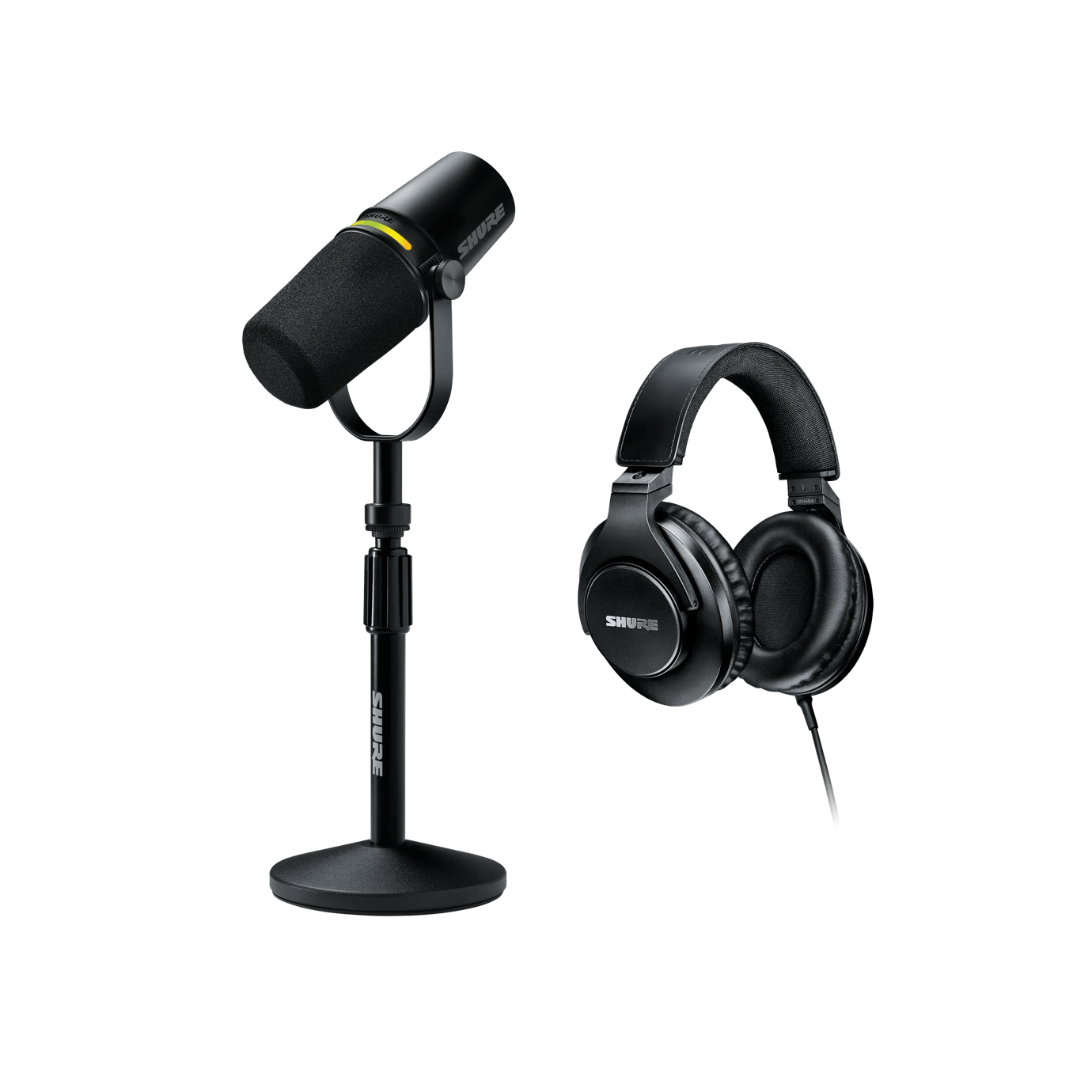 MV7+ Podcast Microphone, Desktop Microphone Stand and SRH440A Professional Recording Headphones.