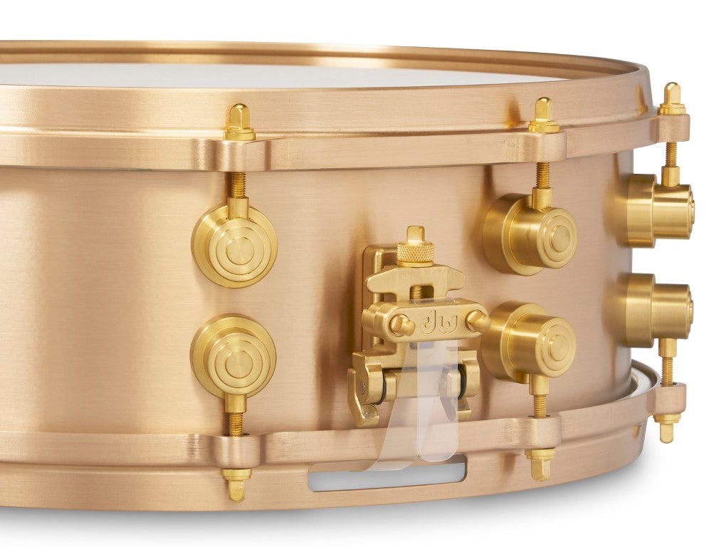 The snare is fitted with True-Cast counter hoops, Mini Turret Lugs, Mini MAG™ throw off, and True-Pitch® tension rods, that were all machined from brass to exacting standards. The drum is capped off with a 20-strand True Tone® snare wires and Remo Ambassador single-ply snare heads with DW MFG logos.