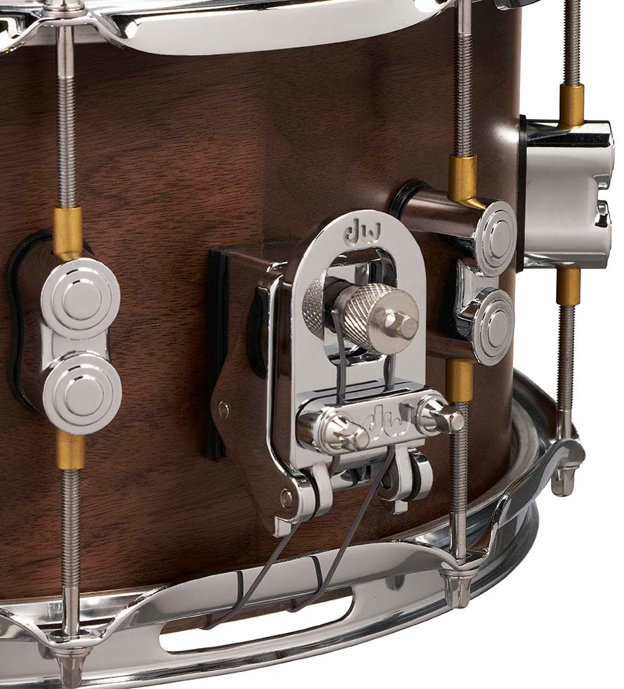 This 8”x 14” (PDSN0814MWNS) 20-ply hybrid shell snare drum is a welcome addition to the complete line of PDP offerings. The ultra-thick drum is made with 16 plies of European maple at its core and 4 plies of walnut both inside and outside. Outfitted with a MAG throw-off and distinct dual-turret lugs, this snare produces a fat, throaty sound with a pronounced attack.
