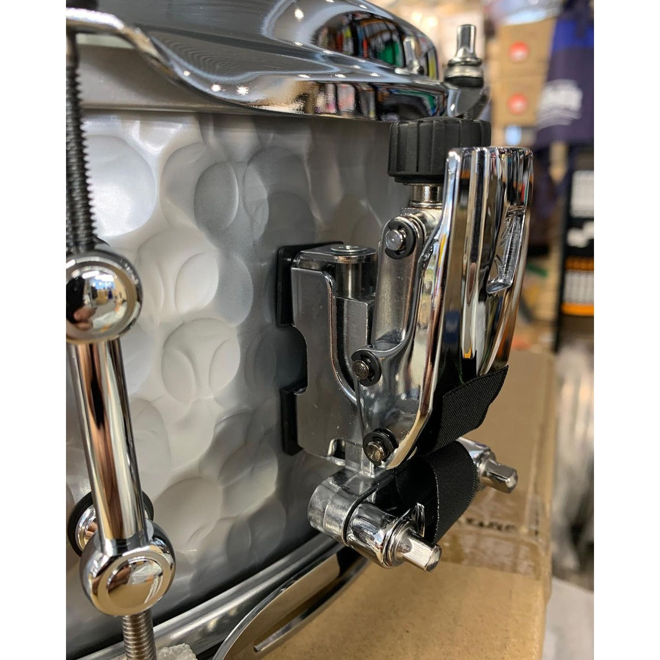 This 14" x 5.5" snare is crafted of 1.2mm hammered steel shell. The hammered process adds tonal complexity, depth, and dryness to the sounds typically associated with TAMA's steel shell, which are bright and penetrating. The more complex tones are generated from the way sound waves asymmetrically reflect off the hammered shell texture.