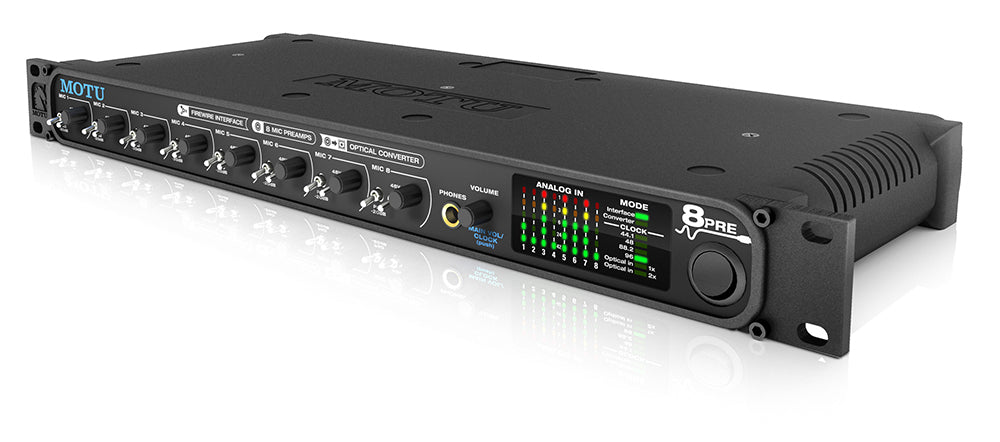 The 8pre FireWire audio interface delivers everything you need to turn your computer into a powerful 24-bit, 96kHz digital audio workstation. The 8pre provides eight microphone/instrument preamps with pristine 96kHz analog recording and playback, combined with 8 channels of ADAT optical digital I/O. Expand your system by connecting additional 8pres or other MOTU FireWire audio interfaces.