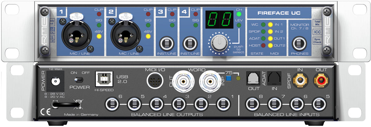 The compact Fireface UC has been uncompromisingly optimized for highest performance under Windows and Mac OS. Based on a newly developed RME Hammerfall core the Fireface UC provides revolutionary ultra-low latencies even with multiple channels. It uses two different firmware versions with different transfer methods to remove current restrictions of typical USB audio interfaces. The unit's operating mode Win or Mac can be changed directly at the unit at any time. Under Mac OS the Fireface's MIDI ports are class compliant, the operating system therefore automatically uses the included MIDI driver.
