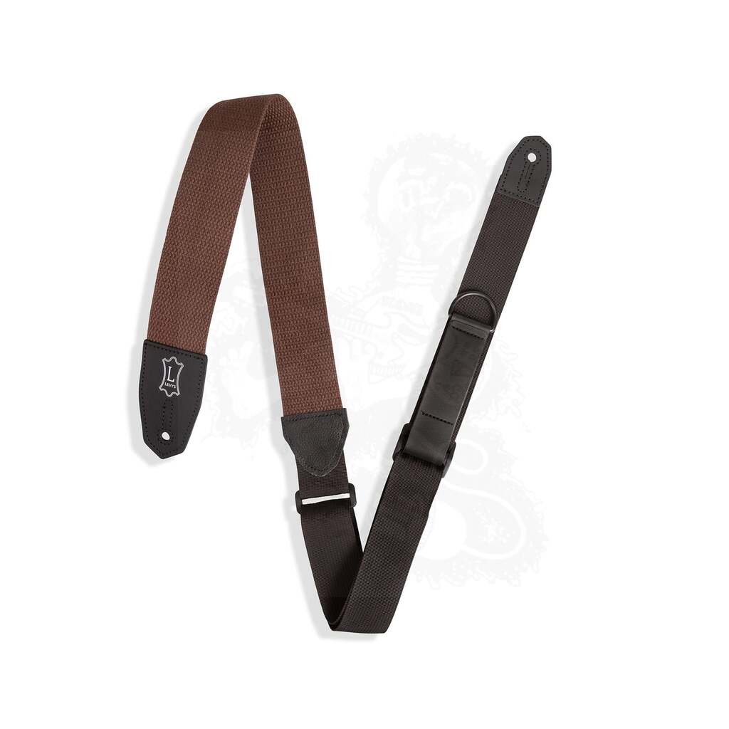 3 inch Right Height Brown Cotton Leather Guitar Strap Featuring RipChord Technology™ for Easy Adjust. Black Webbing And Leather With Polyester Webbing Adjustable From 43 to 57 inches.