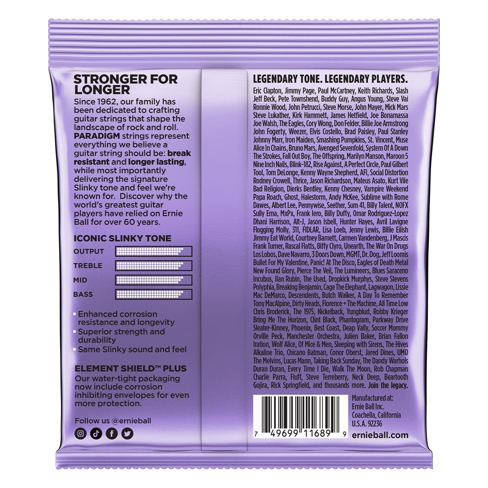 Ernie Ball Slinky Paradigm Electric Guitar Strings provide unprecedented strength and longer life while retaining 100% Slinky tone and feel. Ernie Ball's industry-leading ultra-high strength steel is included in both the wound and plain strings along with a patented reinforcement at the ball-end twist of each plain string to provide superior tensile and fatigue strength for strings that lock into tune fast and hold up under the most stressful playing styles and conditions. The coupling of Ernie Ball's Everlast nanotreatment with breakthrough plasma-enhanced wrap wire provides added corrosion resistance and reduced accumulation of tone-robbing buildup and debris. Experience the first set of longer-lasting strings that are worth playing with all benefits and no compromises. Gauges 0.010, 0.013, 0.017, 0.028, 0.038, 0.048.