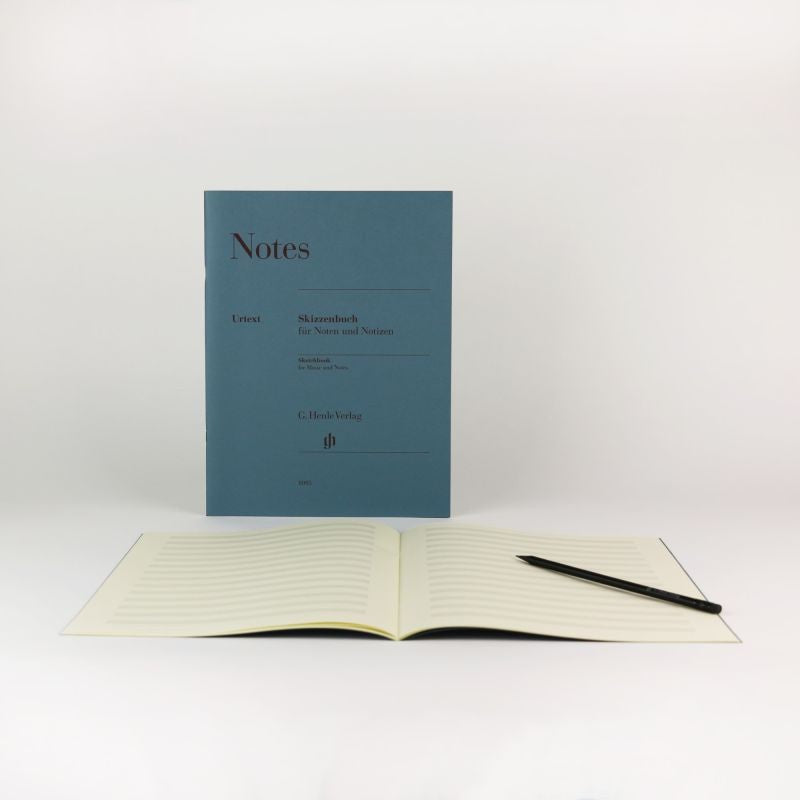 Sketchbook for music and notes with original Henle blue cover and music paper, 32 pages with 14 staves per page, 235 × 310 mm (Urtext size), saddle-stitch binding.