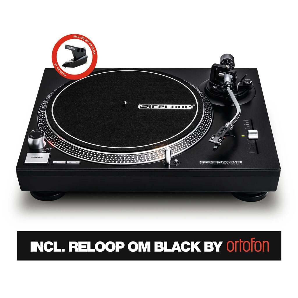 Incl. platter, Reloop OM Black cartridge (by Ortofon), headshell, slipmat, counterweight, power cord, instruction manual