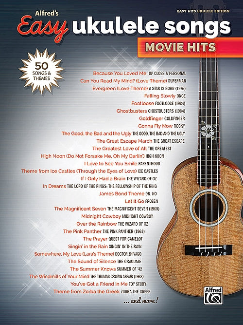 For beginning musicians, Alfred's Easy series is the fast track to developing a repertoire of well-known and fun-to-play songs, while more experienced players will find an excellent resource of favorite songs. The Easy Hits Ukulele format provides melody, chords, and lyrics for easy "strum and sing" performance---plus suggested strum patterns and TAB for any integral "hook" parts. This Movie Hits edition features popular songs and themes from the most timeless of films, such as "Over the Rainbow" from The Wizard of Oz, "Let It Go" from Frozen, "Ghostbusters" from the original 1984 movie, "I See Fire" from The Hobbit series, "Gonna Fly Now" from Rocky, and many more! Titles: Arthur's Theme (Best That You Can Do) (Arthur) * Because You Loved Me (Up Close and Personal) * Better Love (The Legend of Tarzan) * Can You Read My Mind? (Love Theme) (Superman) * Evergreen (Love Theme) (A Star Is Born, 1976) * Everything Is Awesome (Awesome Remixxx!!!) (The Lego Movie) * Falling Slowly (Once) * Footloose (Footloose) * For Your Eyes Only (For Your Eyes Only) * Ghostbusters (Ghostbusters, 1984) * Glory of Love (The Karate Kid Part II) * Goldfinger (Goldfinger) * Gonna Fly Now (Rocky) * The Good, the Bad and the Ugly (Main Title) (The Good, the Bad and the Ugly) * The Great Escape March (The Great Escape) * The Greatest Love of All (The Greatest) * High Noon (Do Not Forsake Me, Oh My Darlin') (High Noon) * (Everything I Do) I Do It for You (Robin Hood: Prince of Thieves) * I Don't Want to Miss a Thing (Armageddon) * I Love to See You Smile (Parenthood) * I See Fire (The Hobbit: The Desolation of Smaug) * Theme from Ice Castles (Through the Eyes of Love) (Ice Castles) * If I Only Had a Brain (The Wizard of Oz) * In Dreams (The Lord of the Rings: The Fellowship of the Ring) * Into the West (The Lord of the Rings: The Return of the King) * It Might Be You (Tootsie) * James Bond Theme (Dr. No) * Let It Go (Frozen) * The Magnificent Seven (The Magnificent Seven) * Mamma Mia (Mamma Mia!) * Midnight Cowboy (Midnight Cowboy) * Never on Sunday (Never on Sunday) * Theme from New York, New York (New York, New York) * Nobody Does It Better (The Spy Who Loved Me) * The Notebook (Main Title) (The Notebook) * Over the Rainbow (The Wizard of Oz) * Theme from Peyton Place (Peyton Place) * The Pink Panther (The Pink Panther) * The Prayer (Quest for Camelot) * Singin' in the Rain (Singin' in the Rain) * Somewhere, My Love (Lara's Theme) (Doctor Zhivago) * The Sound of Silence (The Graduate) * The Summer Knows (Summer of '42) * Talk to the Animals (Doctor Doolittle, 1967) * We Belong Together (Toy Story 3) * What Are You Doing the Rest of Your Life? (The Happy Ending) * What's New Pussycat? (Tom Jones!) * The Windmills of Your Mind (The Thomas Crown Affair) * You've Got a Friend in Me (Toy Story) * Theme from Zorba the Greek (Zorba the Greek).