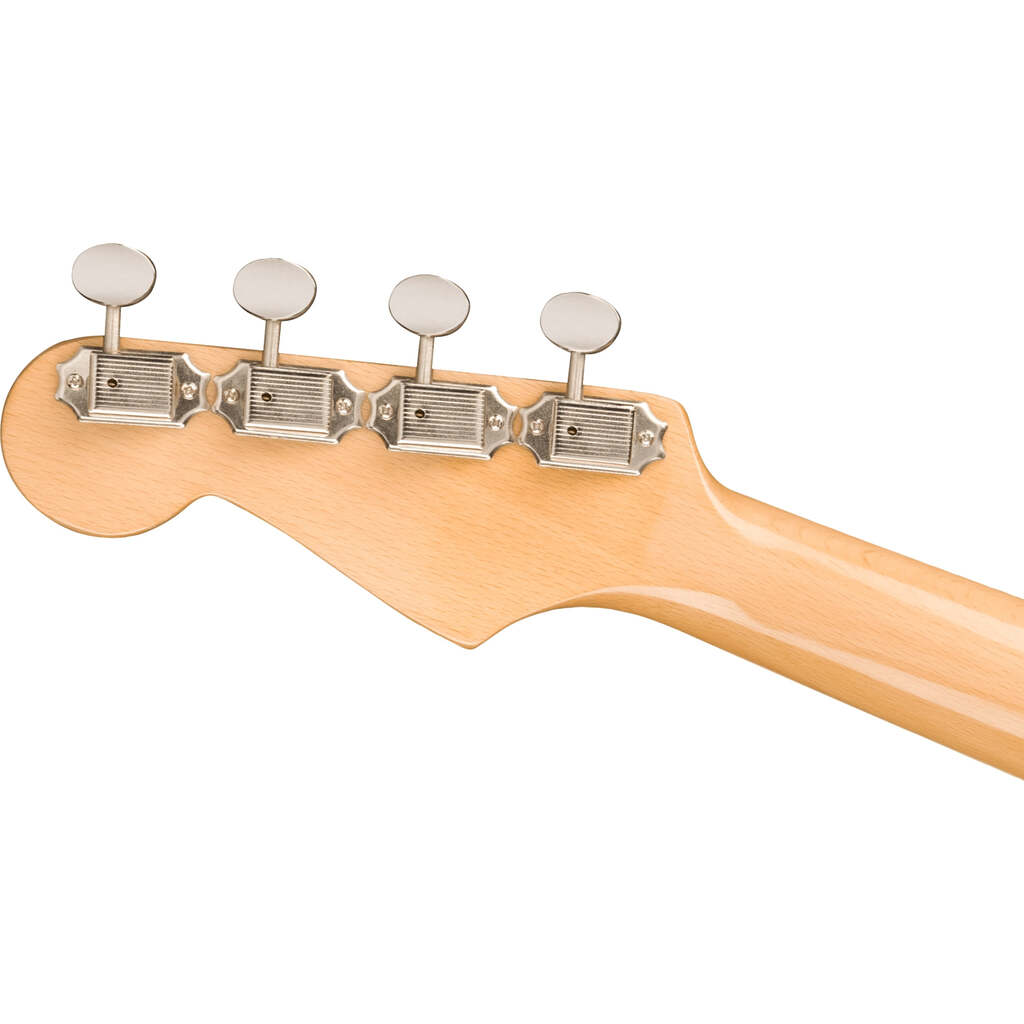 Tipping the hat to Fender's iconic guitar body shapes, the Fullerton Series ukuleles are nothing short of electric. The Fullerton Jazzmaster departs from traditional ukulele construction and aesthetics, while remaining faithful to Fender's history. The Jazzmaster ukulele's pickguard, signature finish color options, and 4-in-line headstock can only be categorized as quintessentially Fender. The Fullerton Jazzmaster is the perfect choice for the ukulele player looking to inject the spirit of rock 'n roll into every performance.