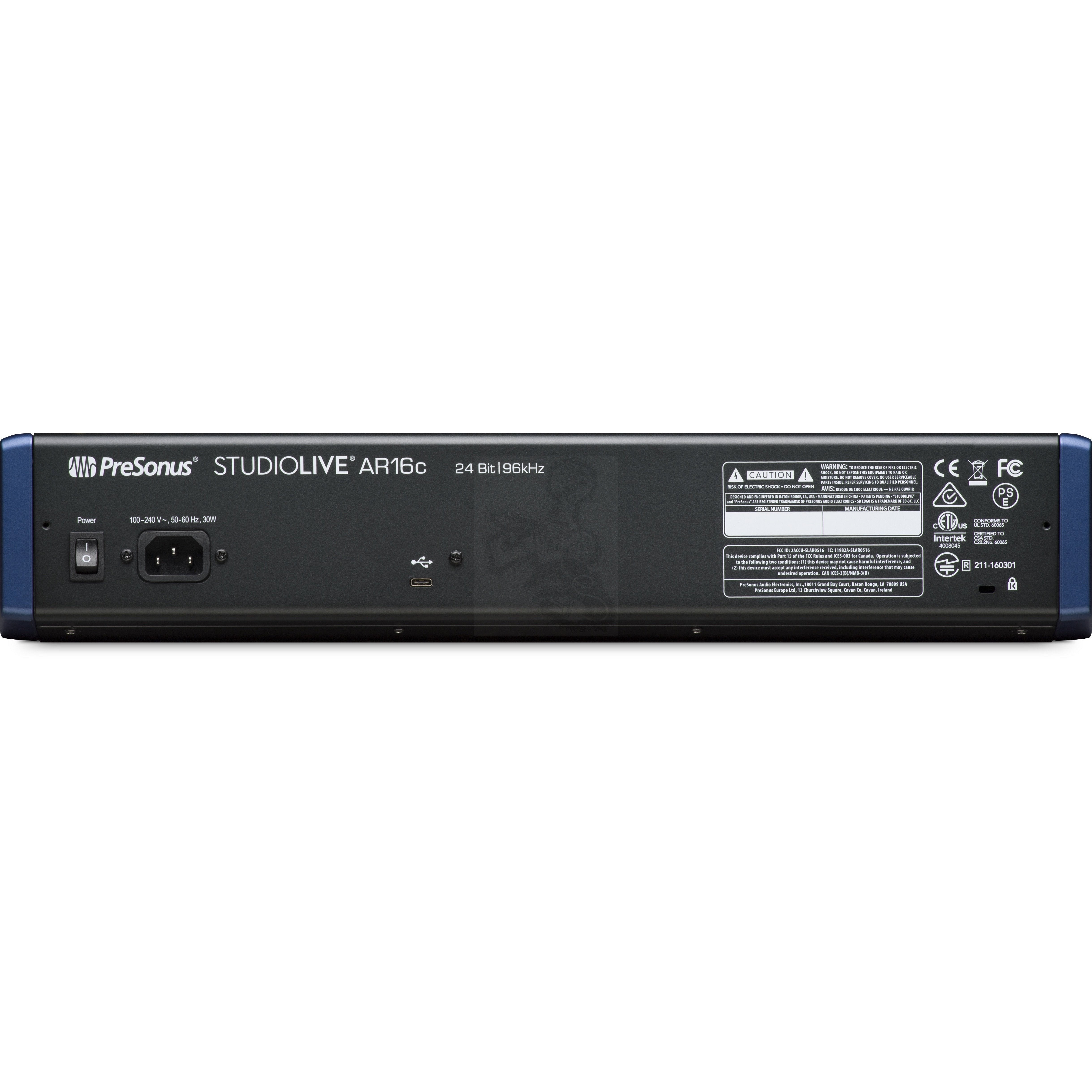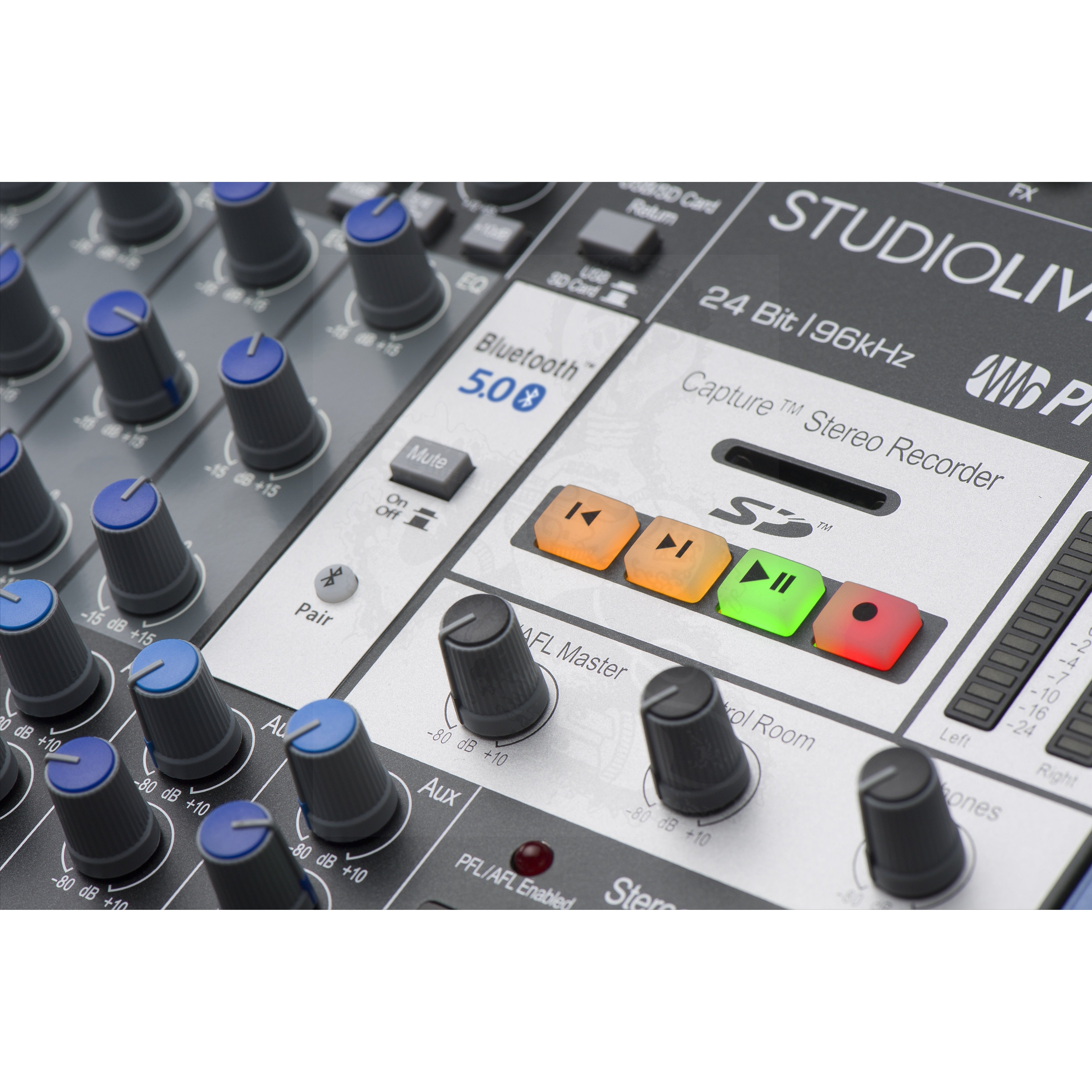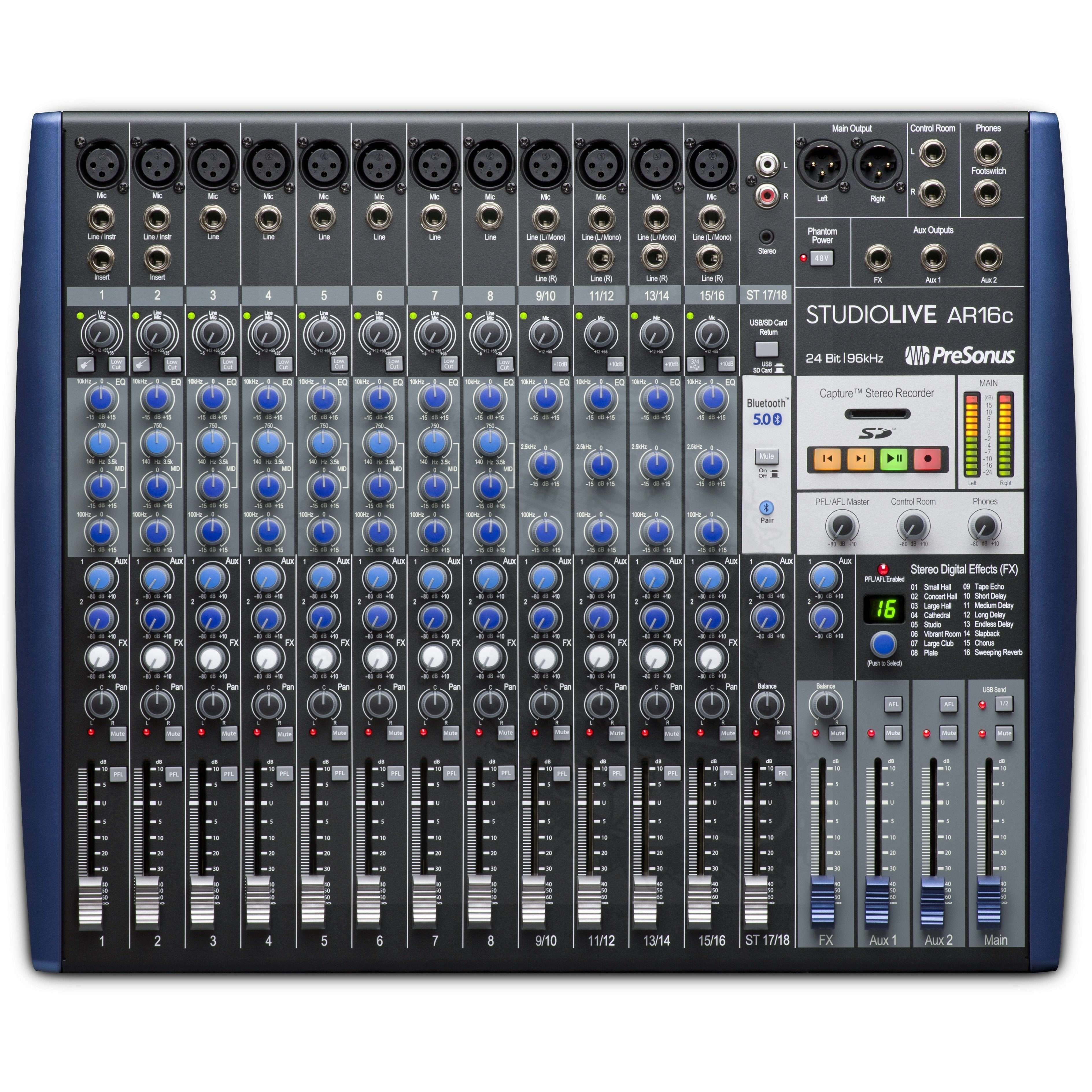 Features Recording 18x4 24-bit/96 kHz, USB 2.0 (over USB-C™ connection) audio recording interface Record every channel plus the main mix 2x2 SD recorder to capture the main mix Supports SD™ and SDHD™ formats up to 32 GB Mixing 18-channel analog mixer 12 balanced microphone inputs with XMAX mic preamps 2 insert points 2 instrument/line inputs 16 balanced line level inputs: 8 mono 4 stereo pairs Stereo Super Channel (Ch. 17/18) with Bluetooth 5.0 input, RCA inputs, 1/8-inch stereo input, and switchable SD/USB stereo playback 8 mono and 4 stereo channels, each with level knob, pan, mute, PFL solo, highpass filter, and 3-band semi-parametric EQ 2 monitor buses with dedicated channel sends, AFL solo, and balanced TRS output L/R Control Room outputs with level control Headphone output with level control Signal Processing Highpass filter on every channel 3-band quasi-parametric EQ with sweepable mid-band on each mono channel 3-band semi-parametric EQ on each stereo channel Stereo effects processor with 16 presets, dedicated send and return, and bypass footswitch jack Mic/line boost on stereo channels for low-level input sources and consumer devices Included Software Capture™ live multitrack recording software Studio One ® Artist recording and production software (DAW) Studio Magic plug-in suite Power Internal power supply Standard IEC power connector Physical Sturdy metal construction 60 mm faders Rackmount kit included