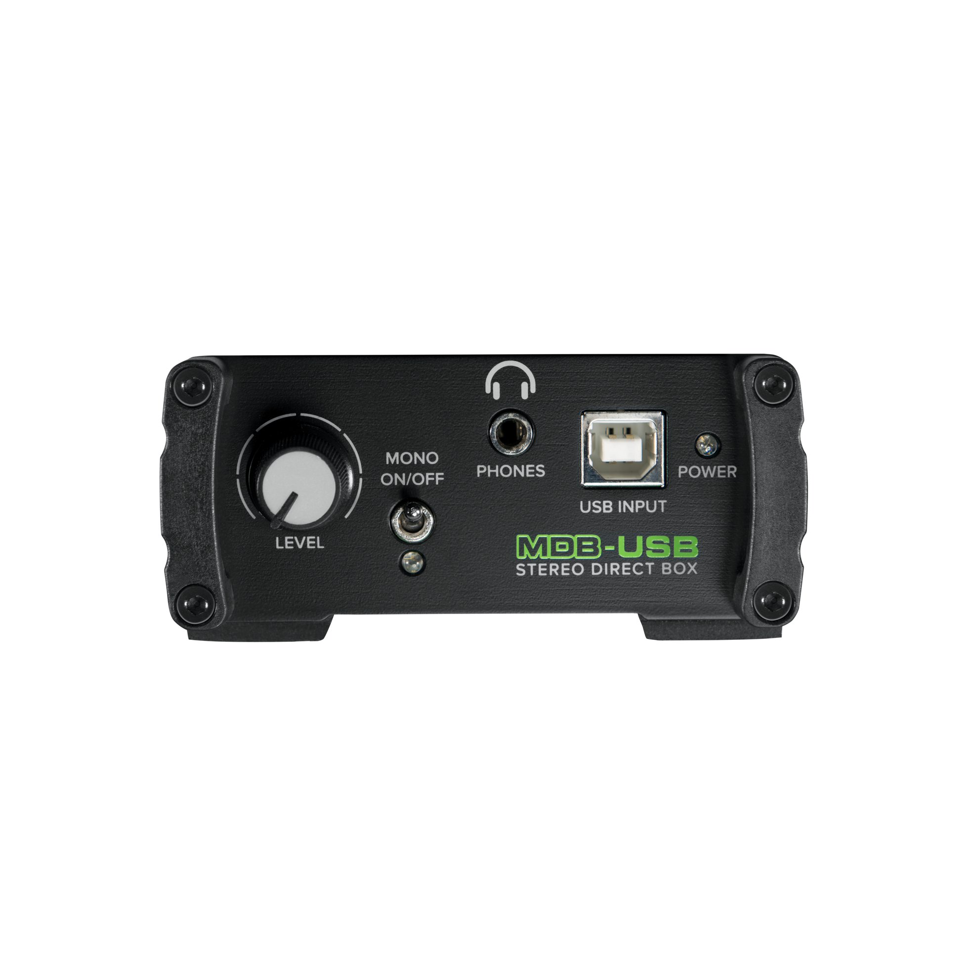 PRODUCT DESCRIPTIONS With the bus-powered MDB-USB Stereo DI, the days of relying on your headphone jack to get audio from a computer into analog gear are over. Combining a high-resolution audio interface with a noise and distortion-free stereo DI, MDB-USB converts your digital audio into clean, balanced, stereo output. Featuring an output level control, headphone output, and mono sum for maximum versatility. Analog outputs are dual XLR with ground lift. FEATURES Connect your computer directly via USB High-resolution 24bit/96kHz interface Balanced, low-impedance XLR outputs with Ground Lift Output level control with Mono switch Headphone output for easy monitoring Noise-free operation Powered by your computer Plug and play operation, no driver required Built-Like-A-Tank™ construction