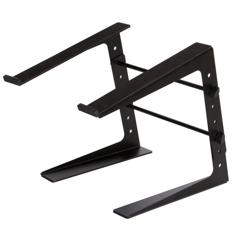 A light and portable stand ideal for holding your laptop, CD player/controller, EFX machine or lighting controller. It features 4 easy line-it-up height adjustments and can hold up to 8 lbs. The angled platform rests your laptop securely against the front bumpers and allows for easy viewing and working positions.