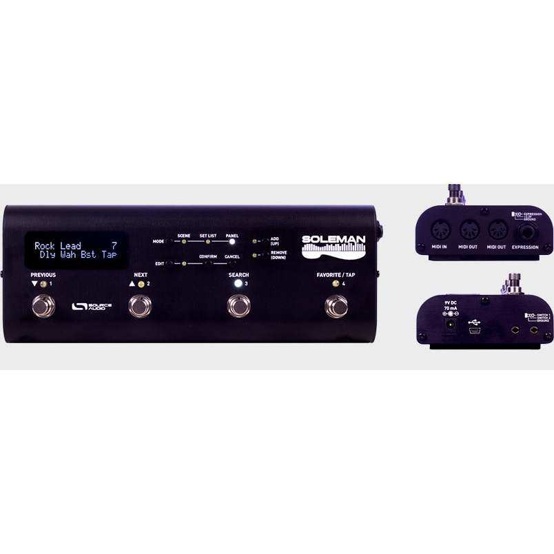 Four Footswitches—Use the footswitches to scroll through presets (ie “scenes”), launch individual MIDI messages, step through set lists, or trigger highly customizable MIDI macros. Configure footswitch functionality with any of the Soleman’s three useful control modes.