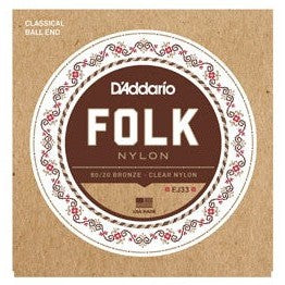EJ33 Folk Nylon strings feature 80/20 bronze basses, clear nylon trebles, and D'Addario ball ends to accommodate a variety of guitars and string changing options.